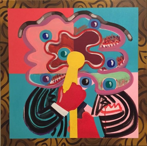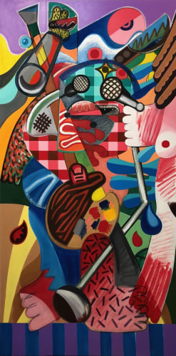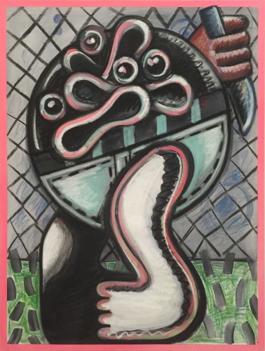 Schenck’s bright, comically grotesque portrayals of artists, comedians, and lounge singers at work look for the links between creativity and self-destructive acts.
