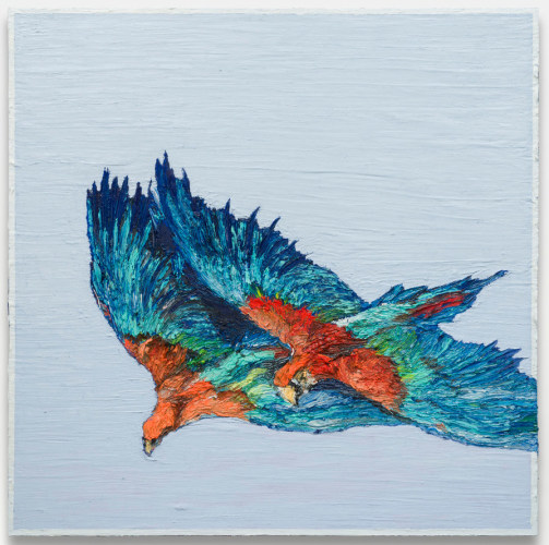 Egan is also interested in how painting can exist in a world where photography is ubiquitous. Each painting in Close to Home has a thin border referencing a snapshot; the border confines the subject into its own world, displacing it from the reality of its objecthood. Egan’s materials and techniques, in their very nature, further intervene in this reconstitution, and the subjects are filtered and charged with grave significance through the surfaces that he manufactures.