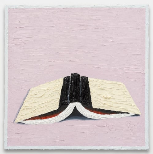 The subjects in Close to Home include buffalo, parrots, mountains, and empty chairs; all of which are sourced from his childhood bedroom. The majority of these paintings are laden with allegory. Egan tends to seek out subjects with inherent moral weight – especially when looking back with the benefit of hindsight, emphasized by the suggestive materialization of the images on the canvas. Many of the objects he paints come from personal history, but the generalized idea of the scene – such as a dresser with open drawers and clothes spilling out unabashedly in the painting “Room” – speak to the larger idea of the carelessness of youth. Other images share a more discreet, decontextualized message like a book left open and face down on a backdrop of a muted pink. This particular painting, titled “Book,” features no other telling background or foreground information, instead leaving a suggestion of innocence or absence.