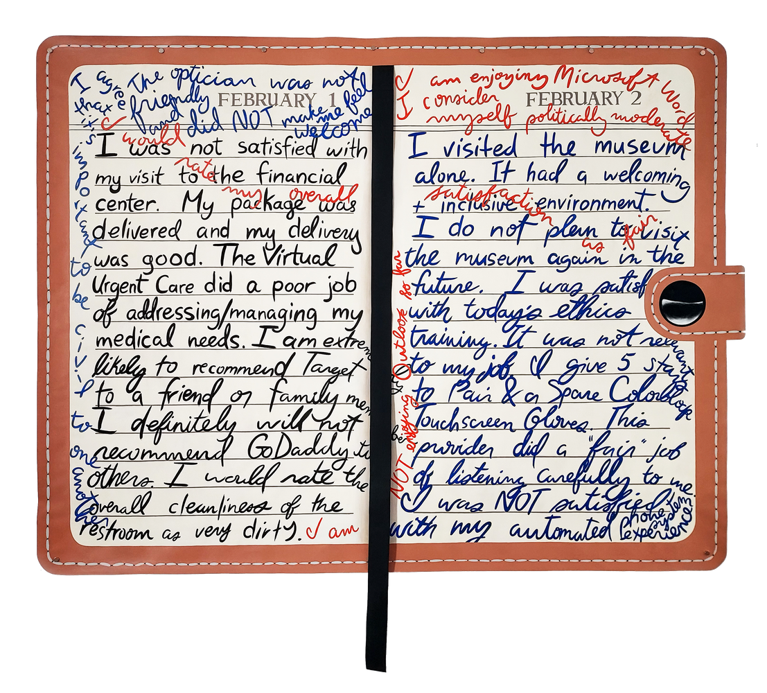 Large-scale works on paper take the form of once commonplace objects that are now increasingly replaced by digital substitutes: a giant, yellow-lined legal pad lists imaginary passwords, and an outsized journal overflows with text from the online surveys flooding our inboxes. It suggests that even private consciousness has been breached by what theorist Jonathan Crary calls “the internet complex.” These exaggerated blow-ups of familiar objects offer glitches in the ever-accelerating movement of technology. With layered paint, collage and trompe l’oeil effects, they ask us to slow down and reconsider the medium of our messages, nurturing a less digital, more physical future.