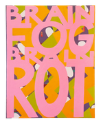 Brown’s small-scale works often combine bright color and intricate pattern with single words or short phrases whose meanings have mutated with online circulation, like “creator,” “contactless” and “brain rot.” Here, the cognitive process of reading is entwined with sensory perception. Using improvisational abstraction, the artist challenges the attention economy with the openness and pleasure of imagination.