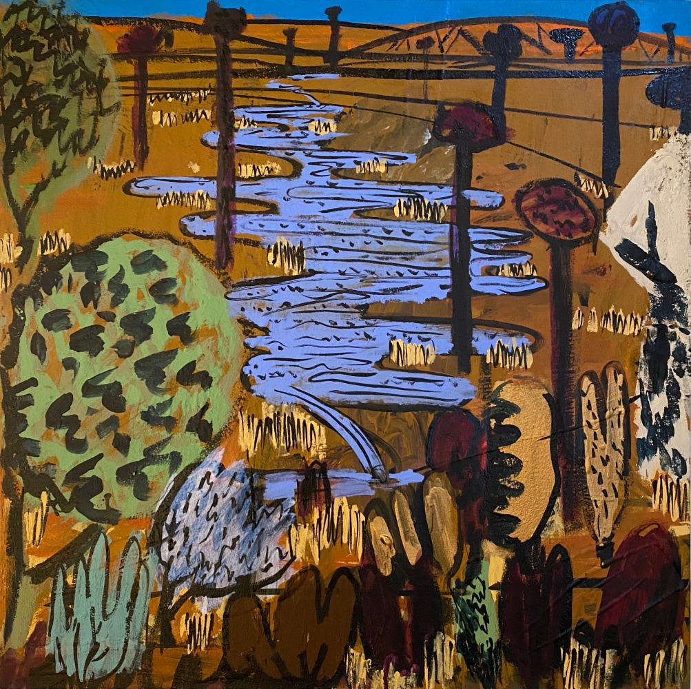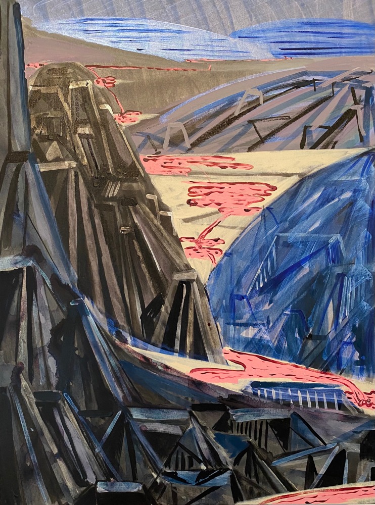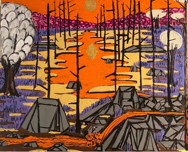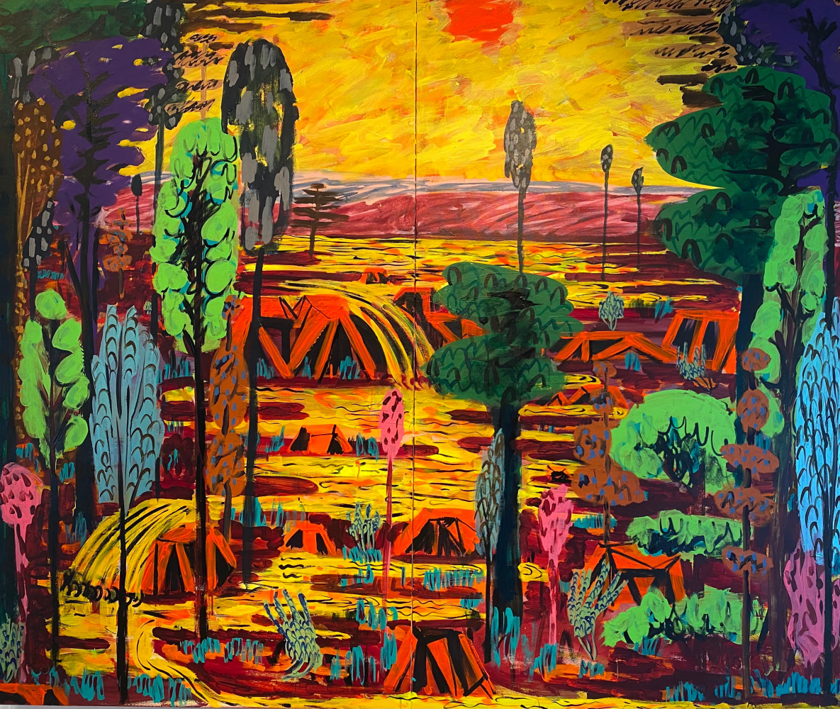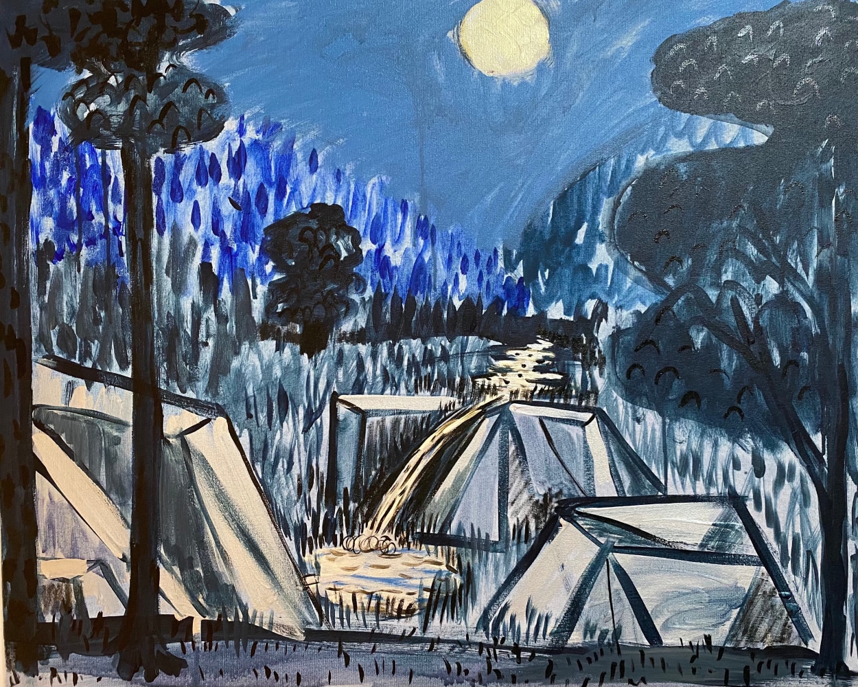 And most recently, in King's marvelous new paintings we have tents—lovely, human-made things—with all the people, poetically speaking, that tents should and do imply. Whole communities of people: eating, drinking, sleeping, toasting s'mores, calling back and forth, and yes, maybe reproducing in the candlelight. Granted, the canvas geometry here is jagged, origami-like, not much headroom in these weird tents, but what are they for, if not to keep us warm and dry and to remind us how to live together in nature, with nature, modestly, without hogging all the space, disgorging odious poisons, or reducing everything we see to ash? The tents feel hopeful; Benjamin King isn't giving up. King captures the unnatural colors of the current moments of climate change with exquisite flair, but in his keen, unflinching, ever-heartfelt style. He also gives us *Something Big To Think About*, something we need to confront with urgency and toughness, and something curiously close to joy: we're not dead yet.