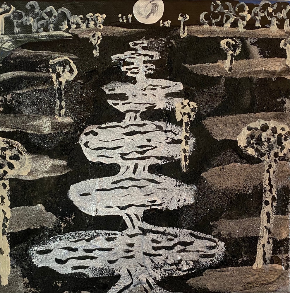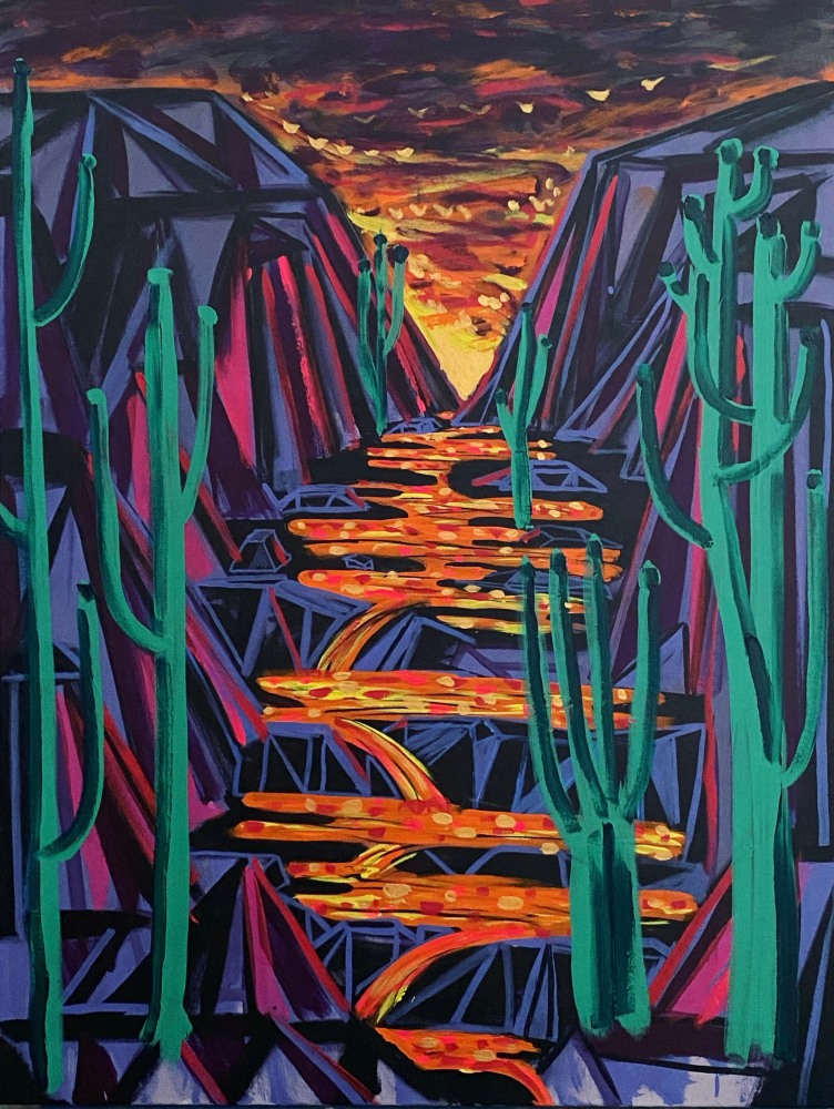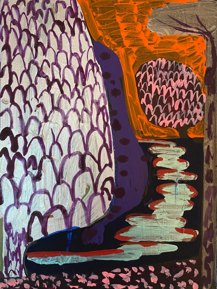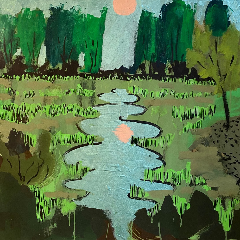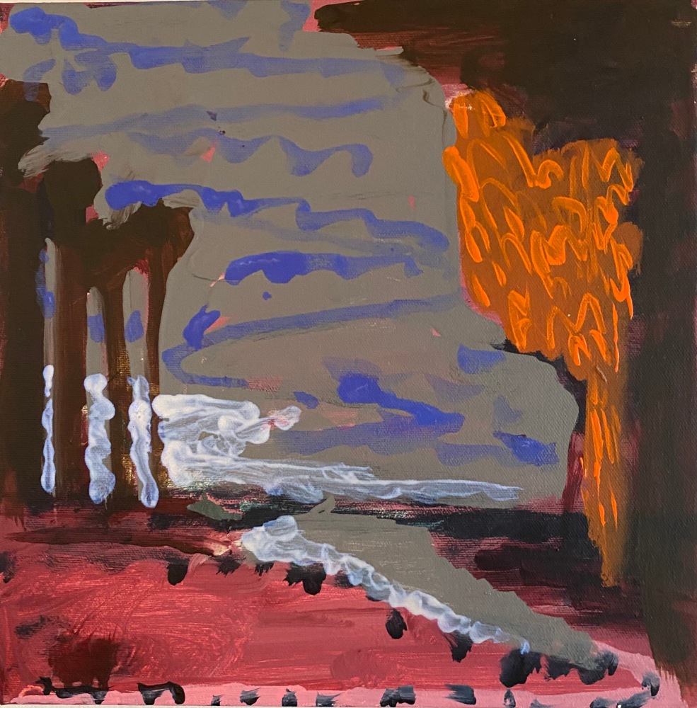 And most recently, in King's marvelous new paintings we have tents—lovely, human-made things—with all the people, poetically speaking, that tents should and do imply. Whole communities of people: eating, drinking, sleeping, toasting s'mores, calling back and forth, and yes, maybe reproducing in the candlelight. Granted, the canvas geometry here is jagged, origami-like, not much headroom in these weird tents, but what are they for, if not to keep us warm and dry and to remind us how to live together in nature, with nature, modestly, without hogging all the space, disgorging odious poisons, or reducing everything we see to ash? The tents feel hopeful; Benjamin King isn't giving up. King captures the unnatural colors of the current moments of climate change with exquisite flair, but in his keen, unflinching, ever-heartfelt style. He also gives us *Something Big To Think About*, something we need to confront with urgency and toughness, and something curiously close to joy: we're not dead yet.