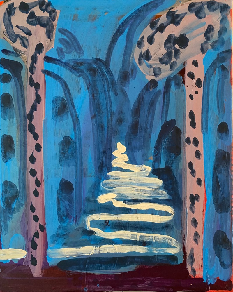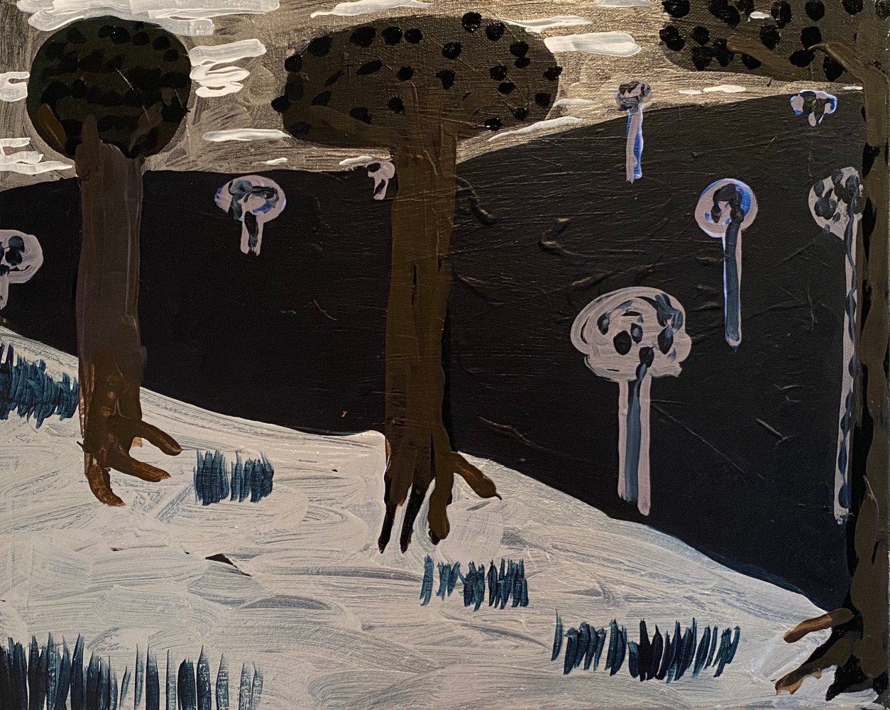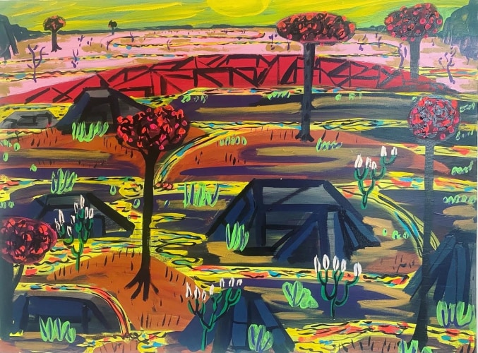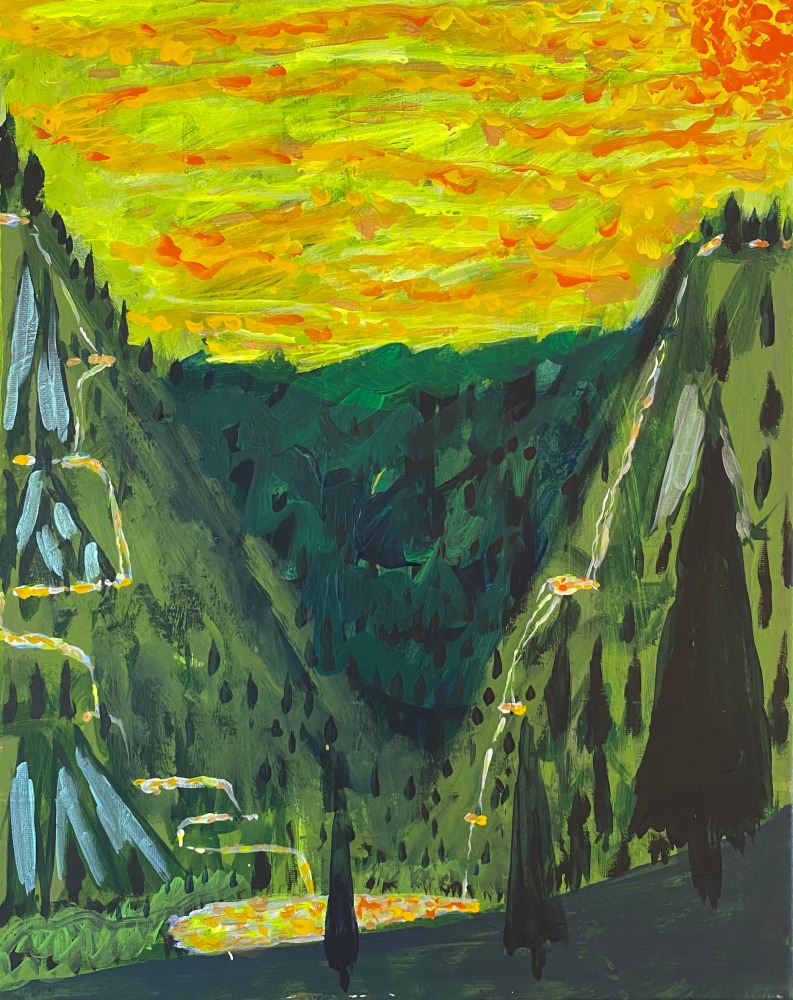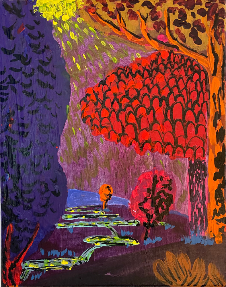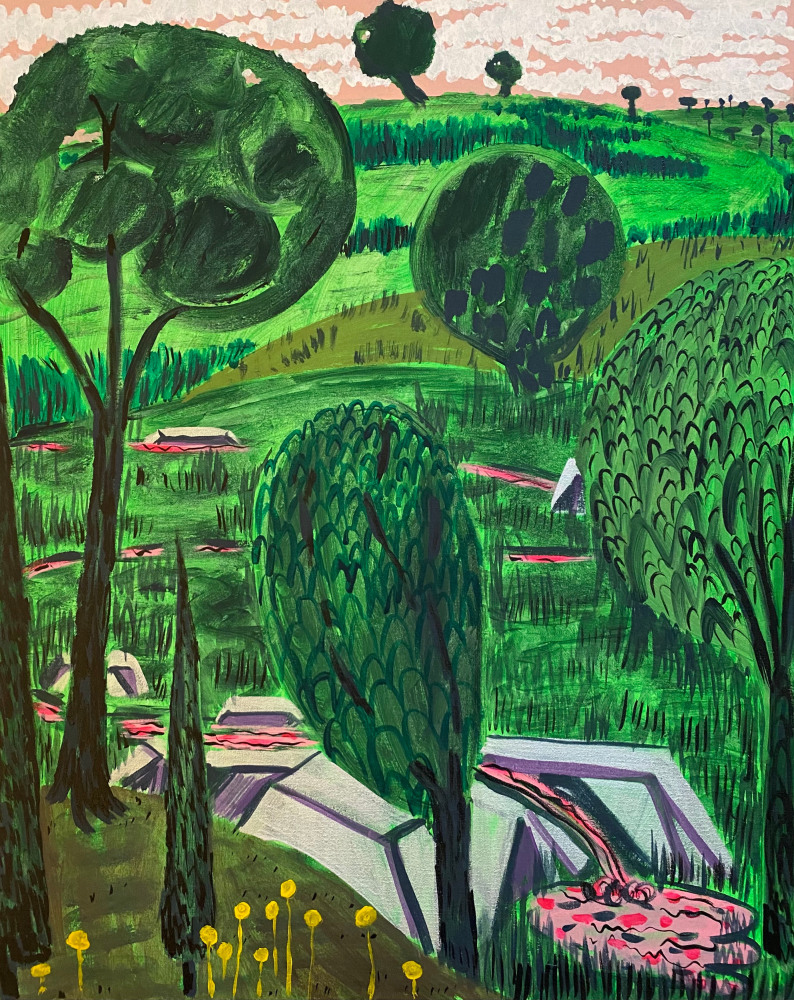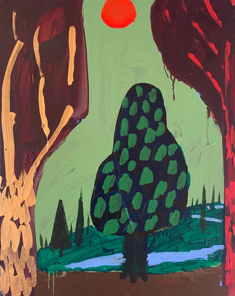 Benjamin King is part of the “New Landscape Painting” generation—a talented group of youngish, punkish, largely North American contemporary artists who bring a new turbulence, uncertainty, and emotional vulnerability to the rendering of the natural world. For King, messing with, either loudly or quietly, the scenic language of the past is indeed part of the point, and witnessed in a slew of shared satiric gambits: an often cartoonish, zine- or outsider-style figuration (trees like giant lollipops, crude triangles for mountains, eerie childlike oval ponds); a preference for dislocating, verging-on-scandalous color schemes; raggedy or scratchy brushwork, like a pattern-language, alternating with preternatural flatness; and, motif-wise, certain edgy, recurrent harbingers of damage—cataracts, explosions, strange growths, night fires, things melting or withering or long dried-up. The landscapes of video gaming and sci-fi graphics sometimes exert a contaminating influence; what's enthralling is how much dazzling beauty is achieved.