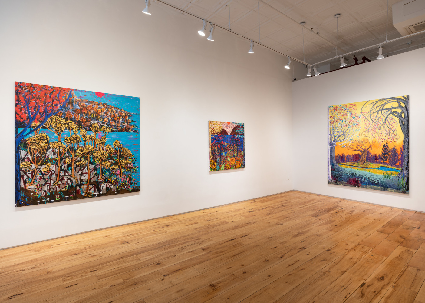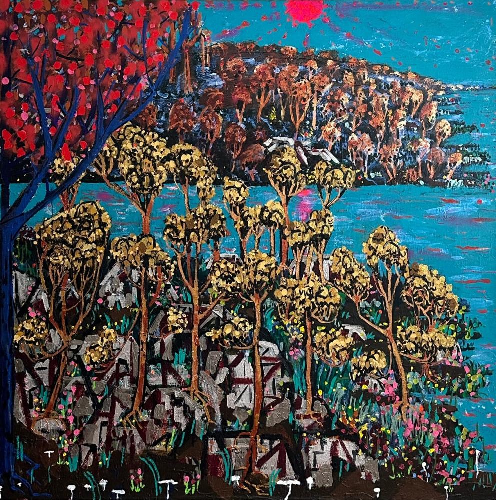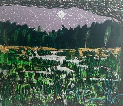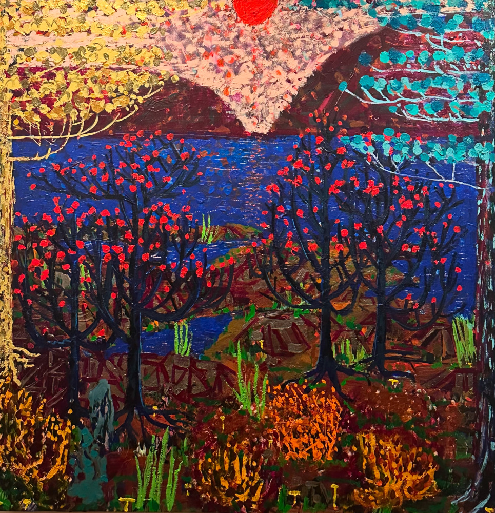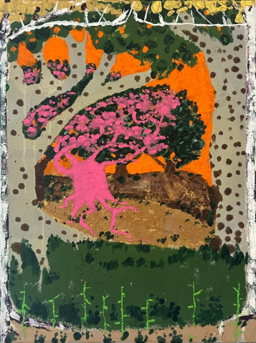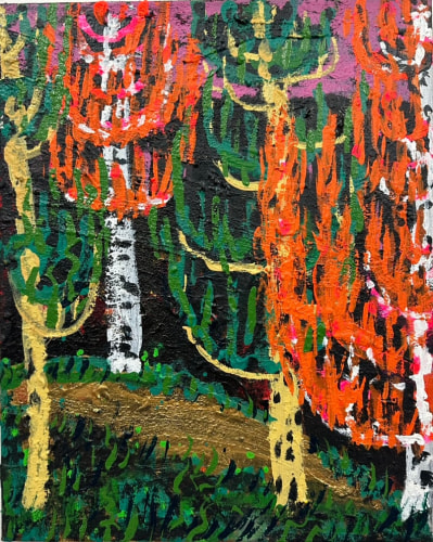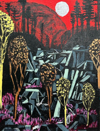 King's process is one of layering and accumulation. He builds his surfaces with a rich impasto, incorporating sand and thick paint to evoke the sedimentary history of fertile marshes. King's impressionist use of dotted leaves capture the ephemeral vitality of trees bathed in sunlight. He ignites his foliage with fiery golds and reds, and then evokes the cool geometry of rocks and lunar twilight —sometimes within the same canvas.