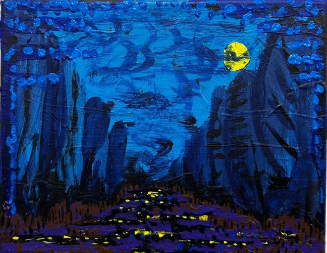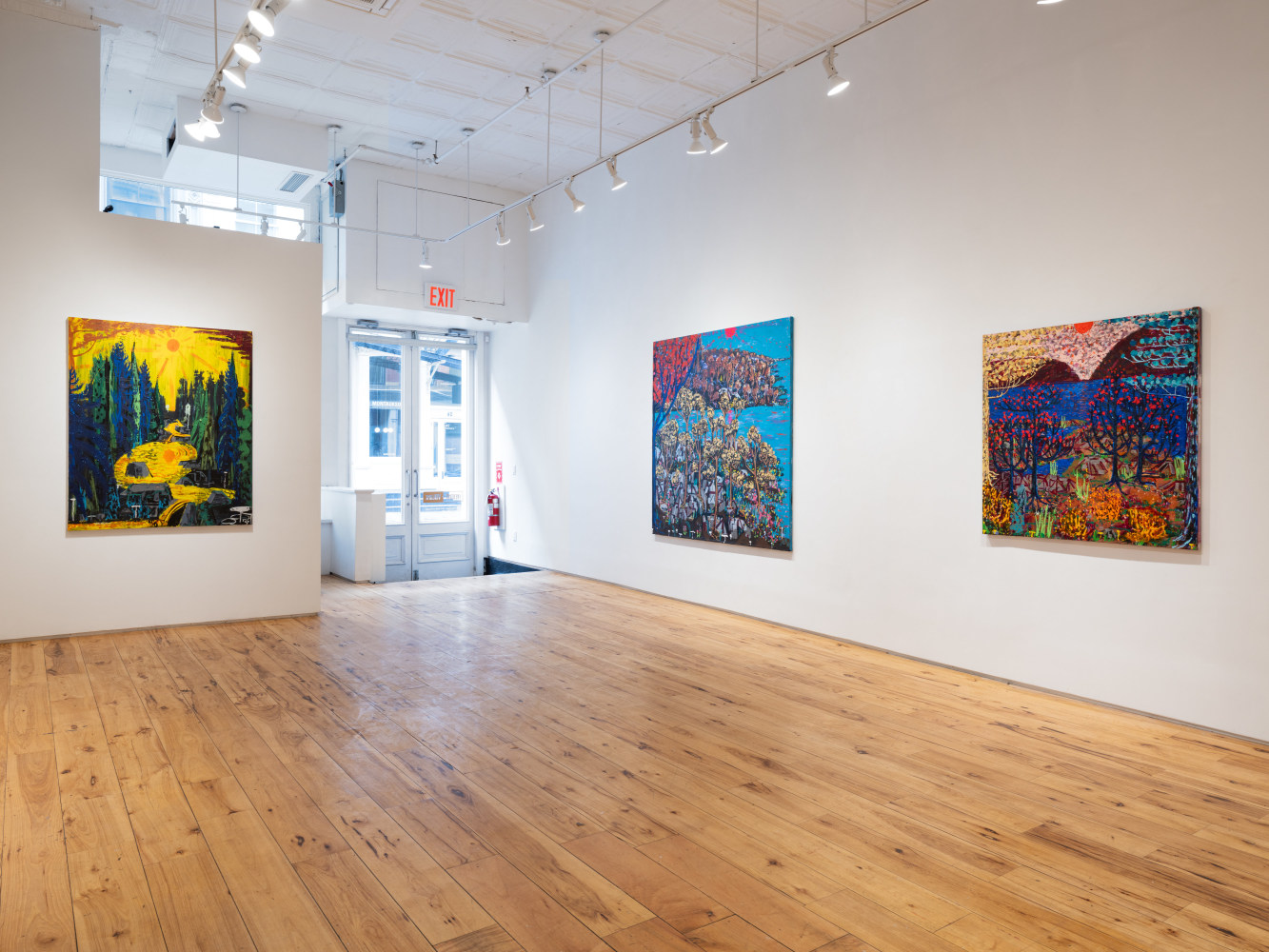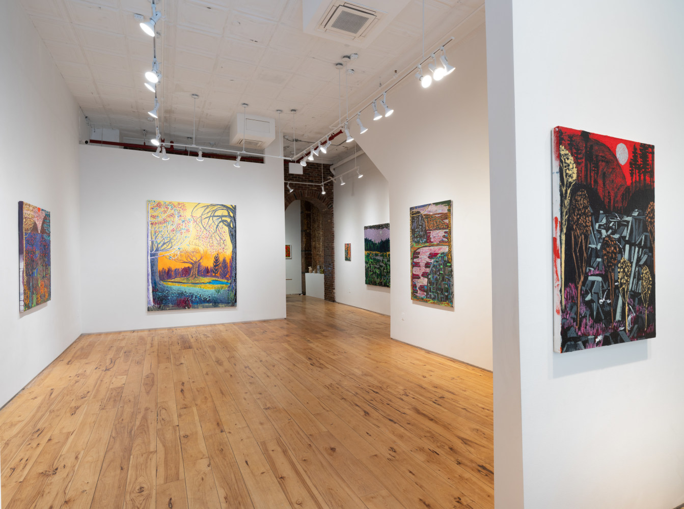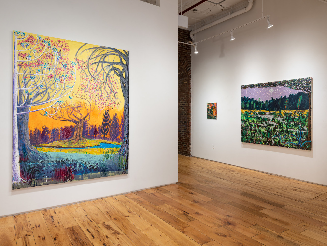 King's process is one of layering and accumulation. He builds his surfaces with a rich impasto, incorporating sand and thick paint to evoke the sedimentary history of fertile marshes. King's impressionist use of dotted leaves capture the ephemeral vitality of trees bathed in sunlight. He ignites his foliage with fiery golds and reds, and then evokes the cool geometry of rocks and lunar twilight —sometimes within the same canvas.