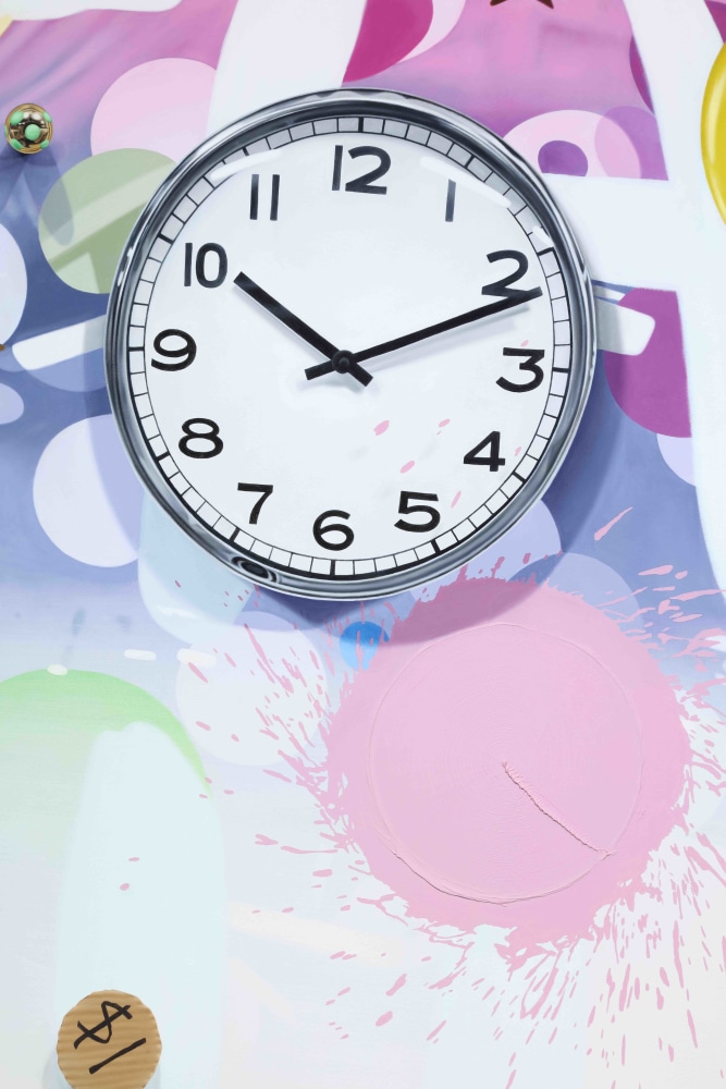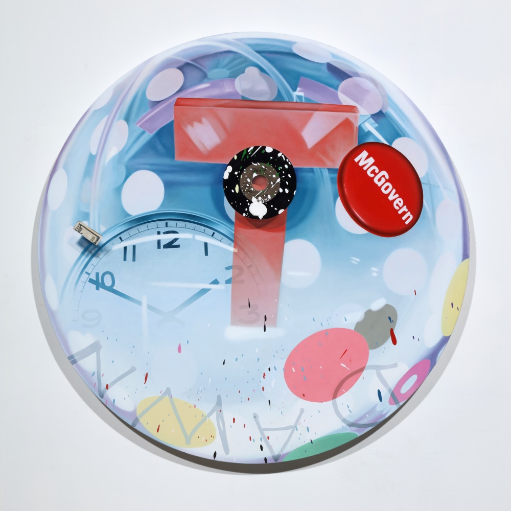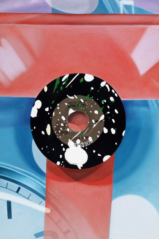 Another work, Convoy LeFreak, looks back to (among other things) the symbolism underlying the transference of value. A round quarter, for instance, goes into the jukebox, setting off the circular motion of the record player, which is then loaded with a vinyl disc from which music emanates. Underlying all this is the mythos of a circle; only in Convoy LeFreak this mythos comes to encompass the campaign button of a small town political candidate, along with actual records and clocks—all of which suggest a kind of axial rhythm cutting through our awareness of synchronicity, repetition, and allusion.