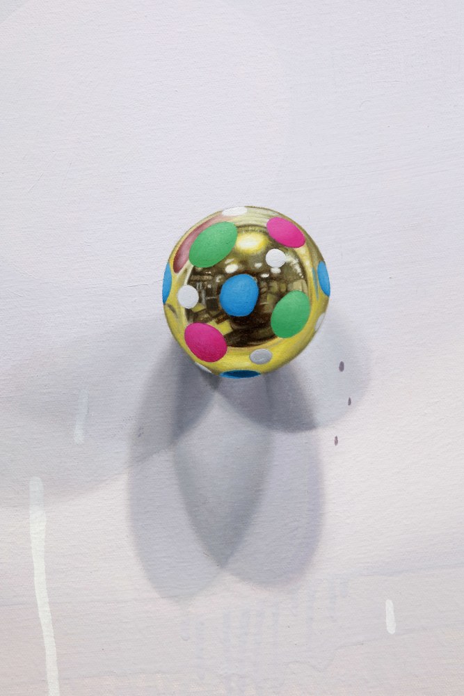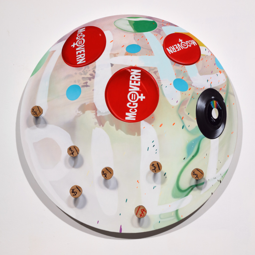 Drennen's paintings are possessed by an autonomous agency. As cultural signifiers, they allude back to the tragedy of Timon, as much as they recreate the story of our own times. Items of cultural debris—such as campaign buttons, vinyl records, and Christmas ornaments—all come to be viewed through a fish-eyed lens which enframes our world as tragedy and farce equally.