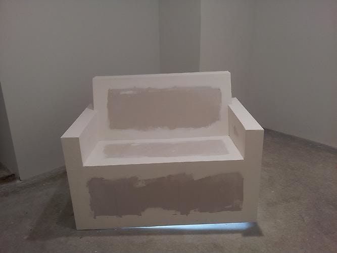 DE: I will be working with a transformed couch, a non-traditional shelf and potted houseplants. I believe these objects function as signifiers that conjure familiarity and memory as themes in my work. These objects will be juxtaposed with a abstract sculpture made of 2x4 studs and a few small paintings created by repeatedly applying acrylic house paint to the support over and over again with a paint roller where each of the dozens of layers is a new transformation. The wood sculpture and paintings are abstract models of growing, evolving systems (much like the living house plants are in fact growing systems) and employ entropic gestures as the primary organizing principle. The abstract works relate to my previous work that dealt with modeling the universe. I am creating a kind of living room that combines commercial building materials with familiar domestic forms and actual living objects in an attempt to create a dialogue around themes of growth, memory, transformation and the human capacity for imagination.