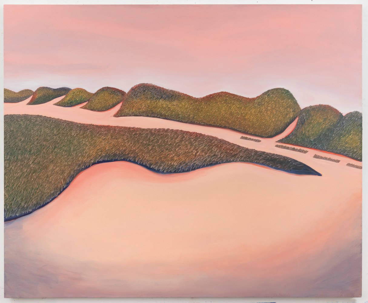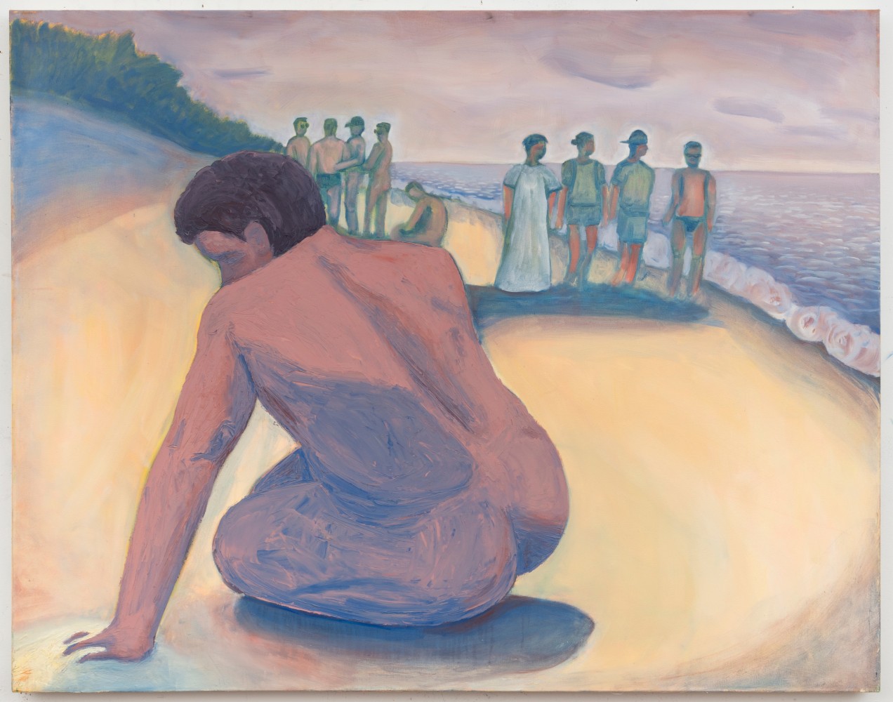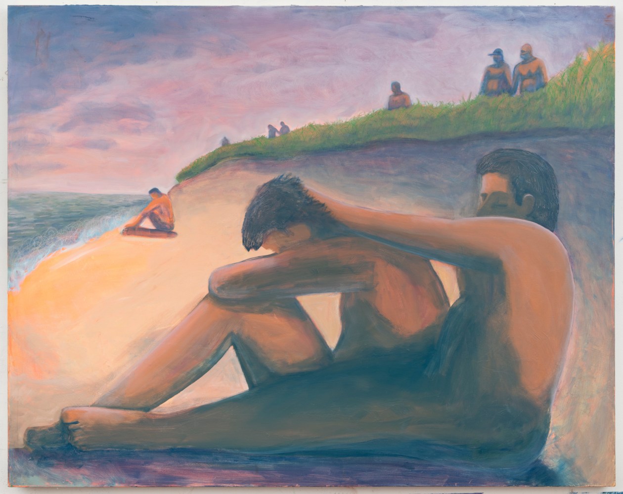 Dylan Hurwitz's depictions of queer beach scenes radiate an intimacy which is transportive. Pathways—similar to neural connections, to the tracings of human bodies weaving through brush, or the face to face encounters which occur whenever you ask for directions to an unknown place—are Hurwitz's primary metaphors. The kind of utopian sociability specific to Herring Cove, Provincetown, for example, which constitutes the theme of his current exhibition, prefigures the range of expression that Hurwitz traces out in his paintings. Less portraits or landscapes than poetic dedications to Herring Cove, Hurwitz's most recent body of work celebrates the experience of loving touch between men, and the power of sex to forge new pathways of intimacy, care, and healing.