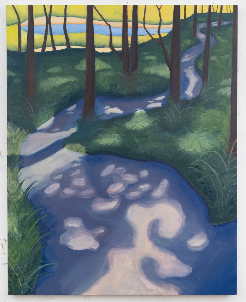 In this way, skin becomes a skein that weaves through the figurations of nature. Less like a memory, and more like the world-transforming pervasiveness of an epiphany, the contours of a walkway in a work like Blue Path, for instance, are imbued with the organicity of the human body. This winding pathway, stippled with sunlight, as well as footprints and detritus dropped from surrounding trees, is like a finger moving through a person's hair. Similarly, the structure in the distance visible through the branches (which could simply be a body of water) takes on a sexual allure, a phallic shape only partially concealed by a pubic beard of trees.