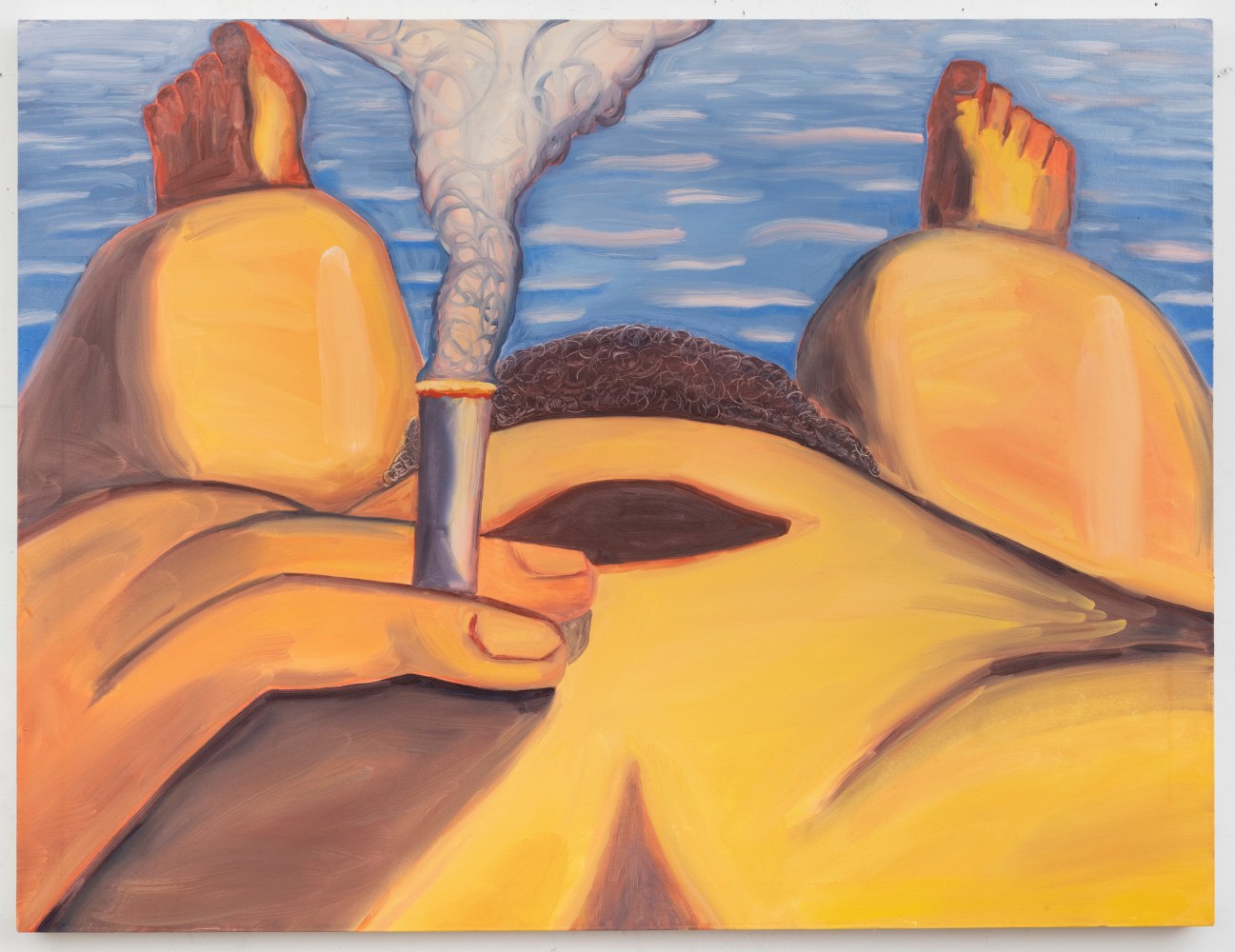 The seemingly massive scale of the body’s appendages, and the closeness of bodies generally—such that the viewer seems to inhabit their skin, smoking their joint, looking down at his own pubic hair as much as theirs—doesn’t in any way diminish the grandeur of the surrounding environment. The water, the beach, the sky—these elements are all given their due weight, and even retain their scale in relation to the nearness of the bodies presented. What Hurwitz's paintings introduce is an interconnectedness that places all the markers and delights of the body and queer sexuality on an equal plane with the environment in which they exist.