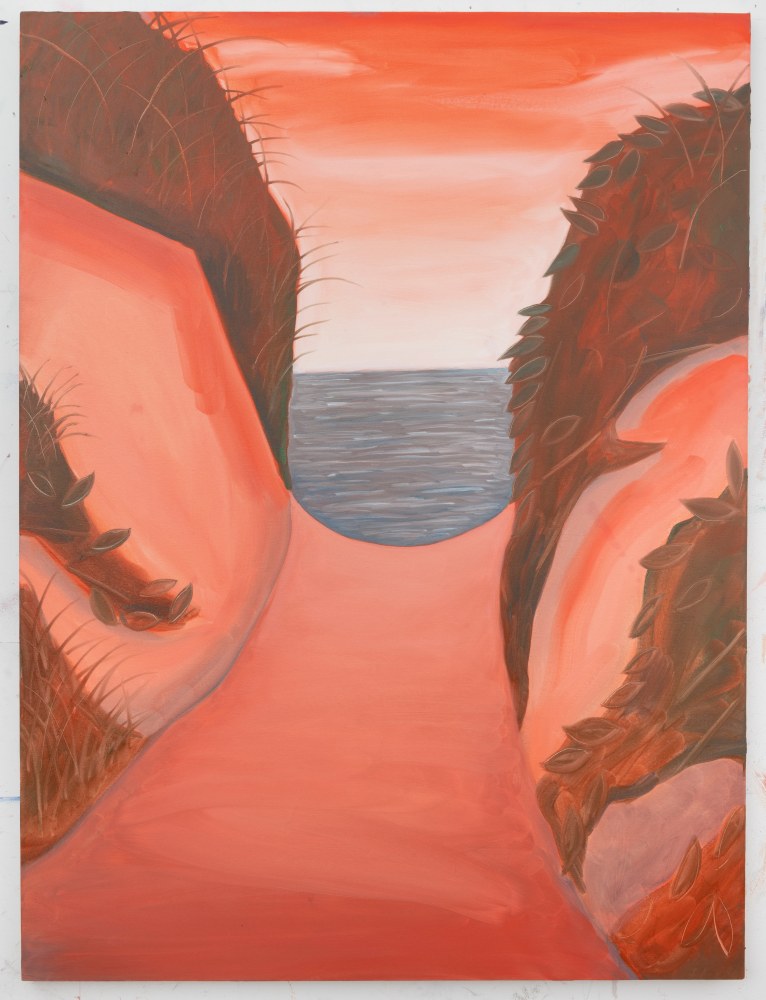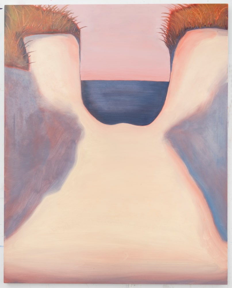 Through Hurwitz’s haptic, beachy landscapes, and the fleshy semaphore of bodies he describes along the shores of Herring Cove, there is an attempt to preserve and protect queer space. Nature, in these paintings, becomes a stage for queer gathering and community, rather than an ambiguous moral order which violently overtakes our experience of love and expressivity.