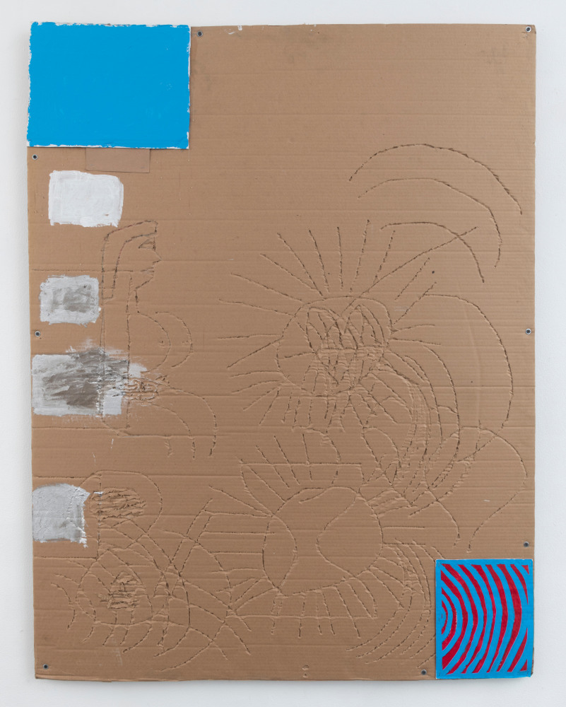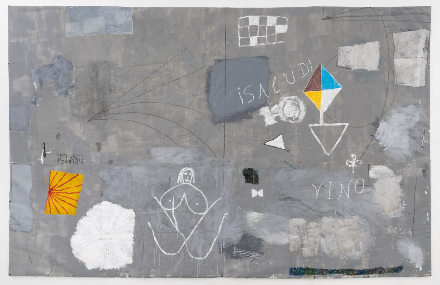 Elements of graffiti and other forms of material erosion are highlighted in these new works, particularly the three large canvases Untitled, which resemble slabs of cement or corroded metal. In these works, Arribas reduces his palette to primarily muted grays and earth tones, and adorns the weathered appearance of his surfaces with informal scrawls and crude drawings. The artist also incorporates sigil-like abstracted geometric forms into these larger works, with the resulting mixture of ontological and formal experimentation creating a sense of an alternate creative reality.