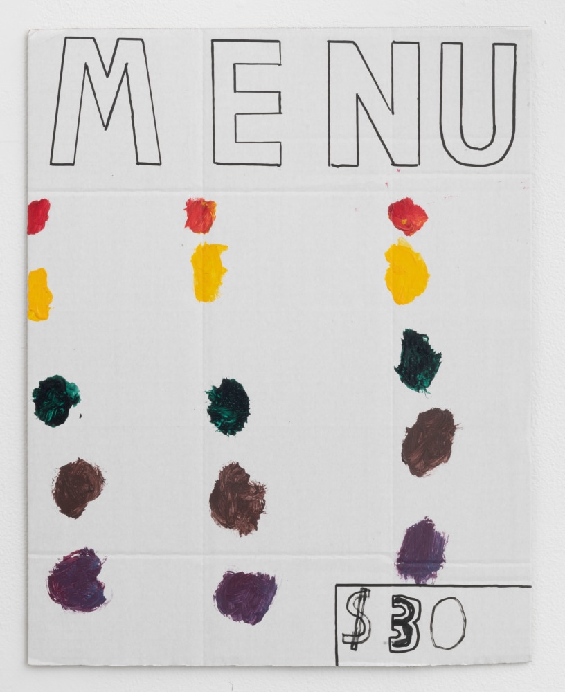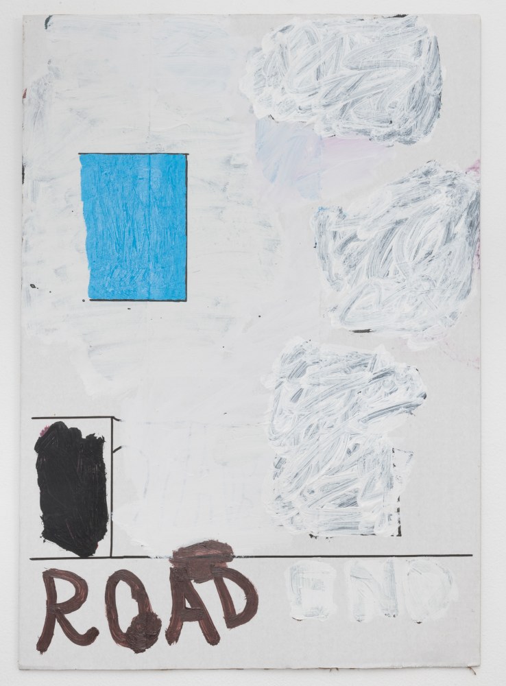 In Night and Darklight, Arribas weaves disparate fragments of text, collage, and abstracted passages of paint into an enigmatic nexus suffused with reflexive meaning. Refuting a singular reading, they instead present a mosaic of narrative and material meaning. Arribas deftly manipulates his materials, coaxing subtle psychological resonances and even slapstick humor from paint and support alike; one of the smaller works on cardboard, emblazoned with the word “Menu”, swaps the typical pictures of food for stark daubs of paint, while a panel marked with “pajaros” (meaning birds) bears only globular, impasto strokes of white paint, underscoring the faint physical traces of the birds’ existence.