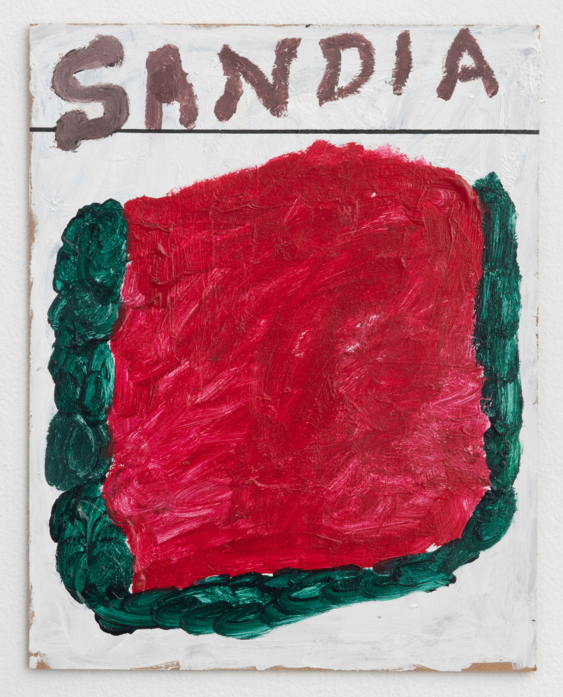 Freight+Volume is excited to announce Frugivore Bats, a new body of acrylic and collage works by Eloy Arribas. Recalling CAMA, Arribas’ 2018 exhibition at Arts+Leisure, the gallery’s uptown project space, these new works present a similarly deconstructed, open-ended approach, punctuated by thick daubs of paint and fluid, impasto brushwork leaving clear traces of the artist’s hand. Snatches of everyday life ricochet throughout the exhibition, as in the Untitled panels bearing images of a slice of watermelon and a glass of wine, and Arribas transforms these immediately recognizable objects into semi-sculptural, intensely corporeal forms that project a mix of familiarity and simultaneous mystery. His appropriation of everyday and ordinary, even banal, objects calls attention to their anonymous ubiquity while suggesting a sort of metaphysical substratum, as if sheathing a contemporary permutation of Plato’s forms within his deconstructed artistic framework. The artist also uses distressed cardboard supports and photographic cut-outs in several works, further blurring the lines between physicality, reality, and representation in Frugivore Bats.