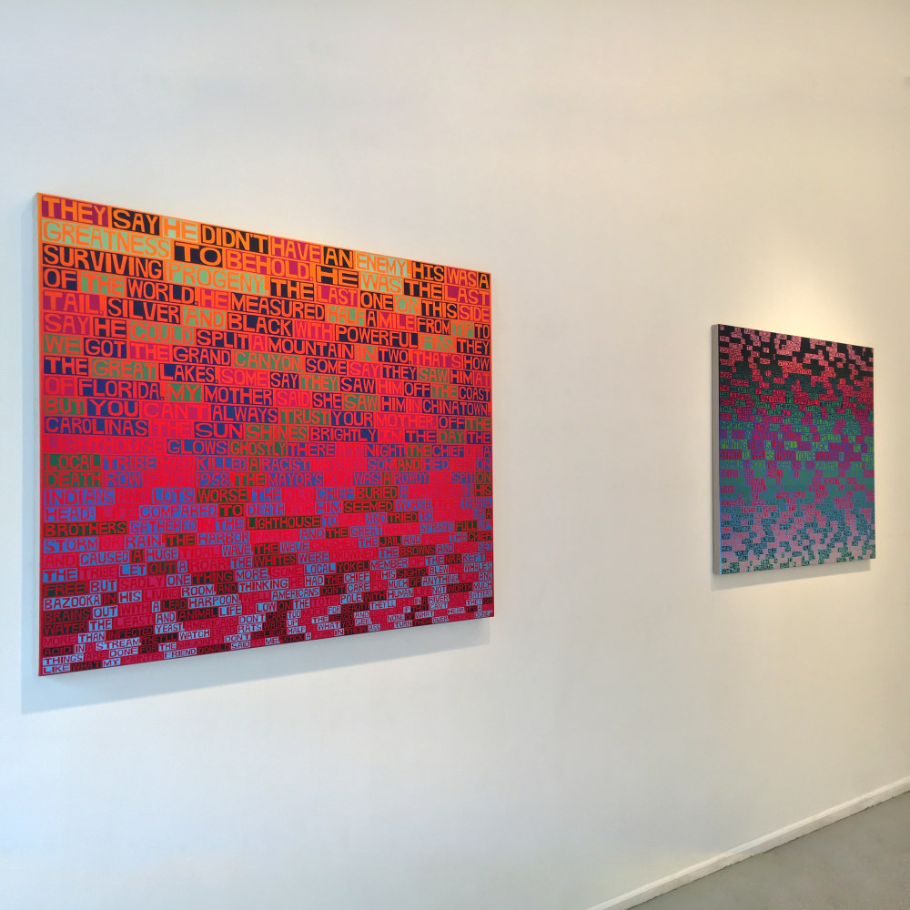 Although the words are painted in order and flow from left to right and top to bottom, one does not typically read them in a traditional manner. As you read the text you read the painting and become tossed around in moments of pure feeling. The varying colors of text used to create the image produce blotches that break up the linear read and suggest more of a strange, idiosyncratic, even tactile poem. The paintings can become flashes and jolts of experience; they make you pause, reflect, look, and think. There are several different ways to read these paintings, and therefore it’s tough to see all their elements at once. The works ask you to spend some time with them, to let the letters and colors explain their content.