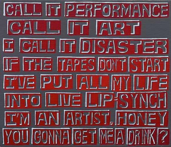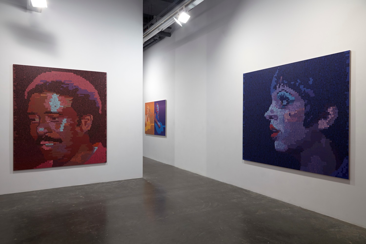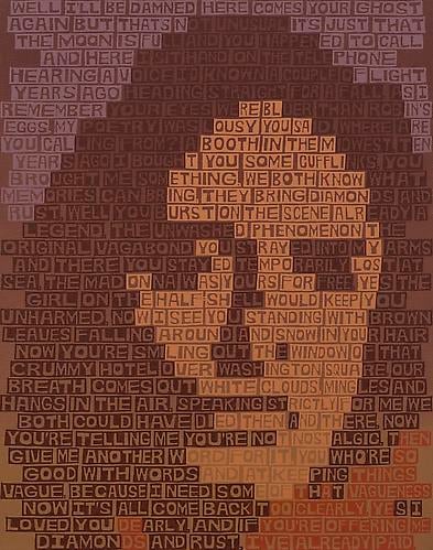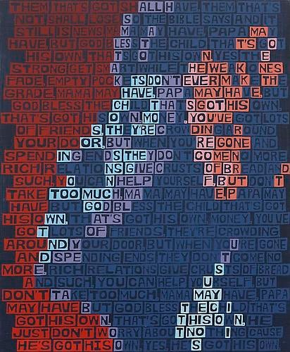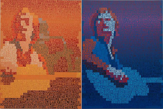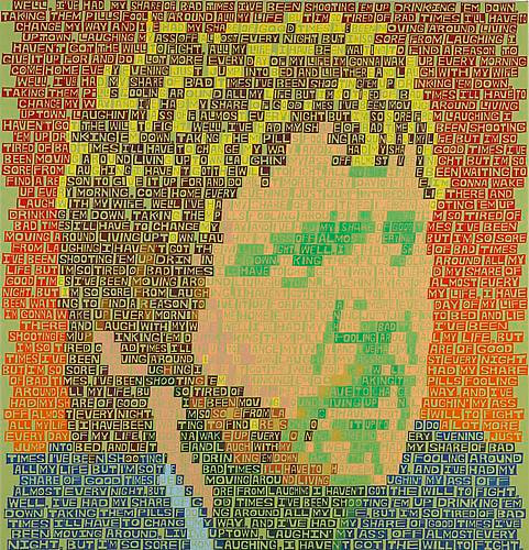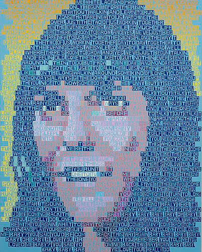 The exhibition discloses that things are not always what they seem, or, in Neil Young’s words, that “there’s more to the picture than meets the eye.” The individual works reveal more than what is presented on the surface. There is a kind of in-and-out phenomenon created by the large fields of text and color. It’s easy to fall into these paintings and slip through the gaps between words, to experience the painting as a painting, as abstraction. The words disappear and they become unadulterated color, or moments of paint, then the portrait reveals itself. The same can be said of the subjects themselves, particularly Karen Carpenter, who projected “wholesome” values seemingly in reaction to the radical voices of the period, but was deeply troubled in her personal life.