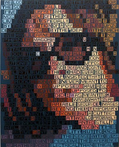 Although the words are painted in order and flow from left to right and top to bottom, one does not typically read them in a traditional manner. As you read the text you read the painting and become tossed around in moments of pure feeling. The varying colors of text used to create the image produce blotches that break up the linear read and suggest more of a strange, idiosyncratic, even tactile poem. The paintings can become flashes and jolts of experience; they make you pause, reflect, look, and think. There are several different ways to read these paintings, and therefore it’s tough to see all their elements at once. The works ask you to spend some time with them, to let the letters and colors explain their content.