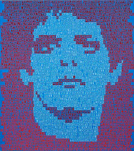 Although the words are painted in order and flow from left to right and top to bottom, one does not typically read them in a traditional manner. As you read the text you read the painting and become tossed around in moments of pure feeling. The varying colors of text used to create the image produce blotches that break up the linear read and suggest more of a strange, idiosyncratic, even tactile poem. The paintings can become flashes and jolts of experience; they make you pause, reflect, look, and think. There are several different ways to read these paintings, and therefore it’s tough to see all their elements at once. The works ask you to spend some time with them, to let the letters and colors explain their content.