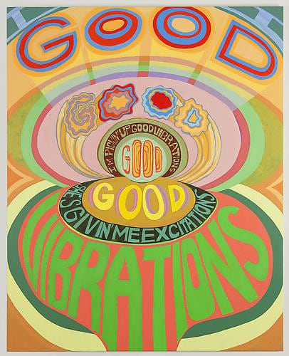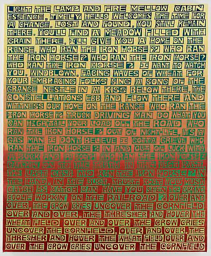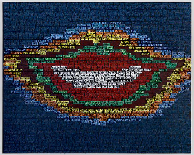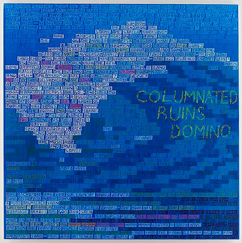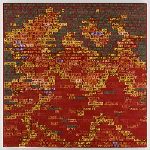 But in fact den Breejen’s work does much more than just illustrate text or illuminate theory—in many ways he brings the words back to life. The lyrics, written by Van Dyke Parks, are painted in a grid covering the entire surface. His paintings are from the gut—bold, intuitive and visceral in conveying the emotional power and effect of music. Stanzas change color, are layered in resonant hues to produce a bodily, hallucinatory impression on the viewer. One actually feels the chords and melodies emanate from a work like “Surf's Up” or “Smile II,” for example, through the shifts in color, font and style den Breejen employs. Like Christian Marclay, the artist successfully bridges the crossover between music and art in his work, and in “Smile” den Breejen has also chosen to tackle a theme he’s been obsessed with for years: how an artist (or musician, writer, dancer, filmmaker) can sometimes fly too close to the sun in creating a major work and suffer the consequences.
