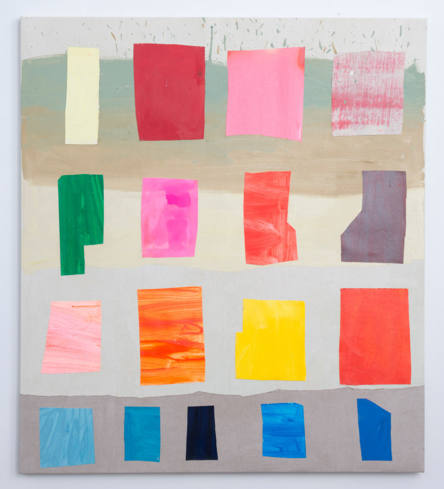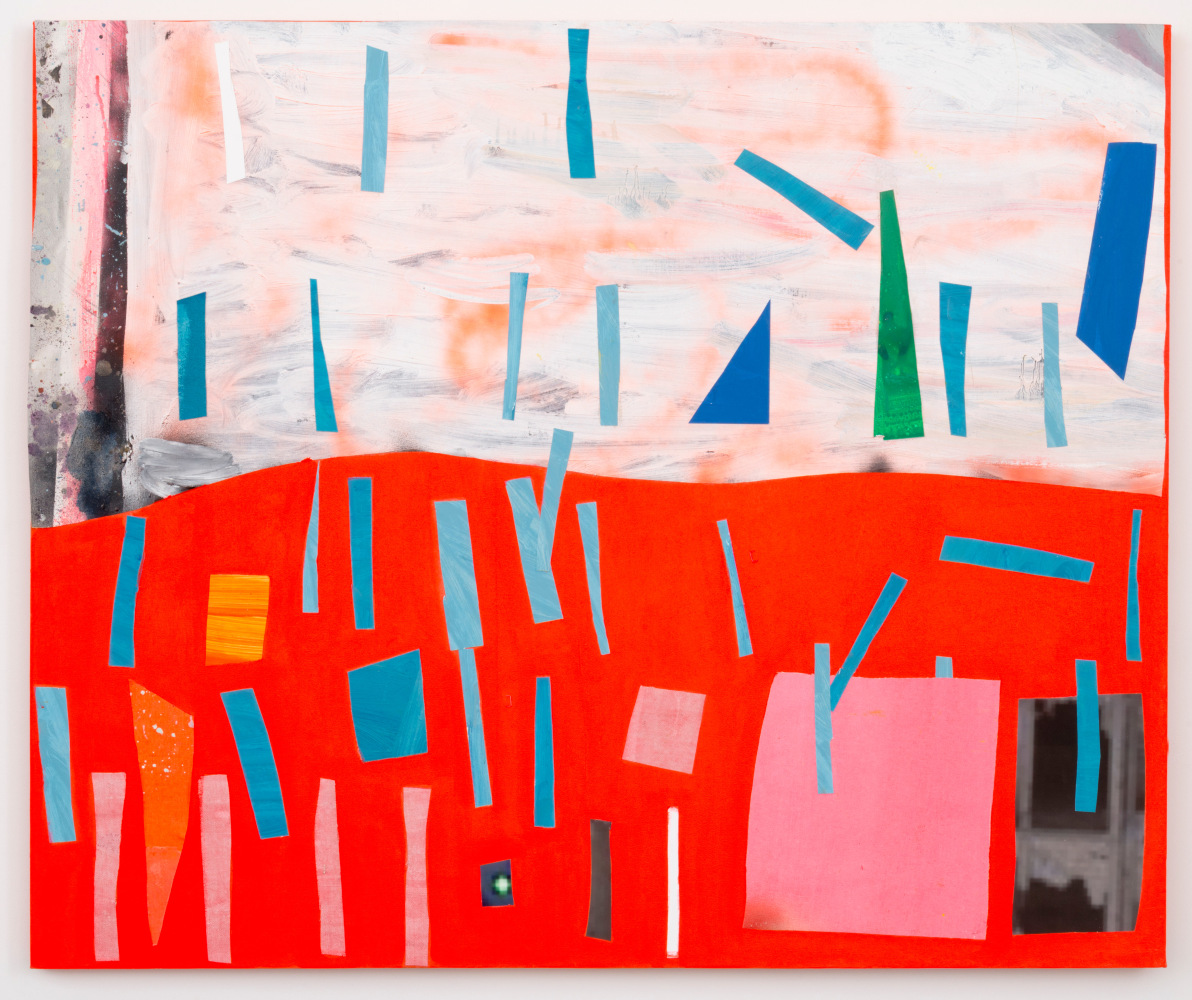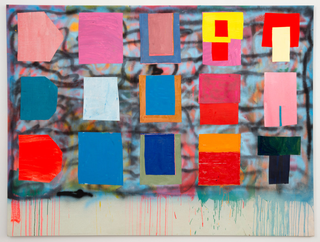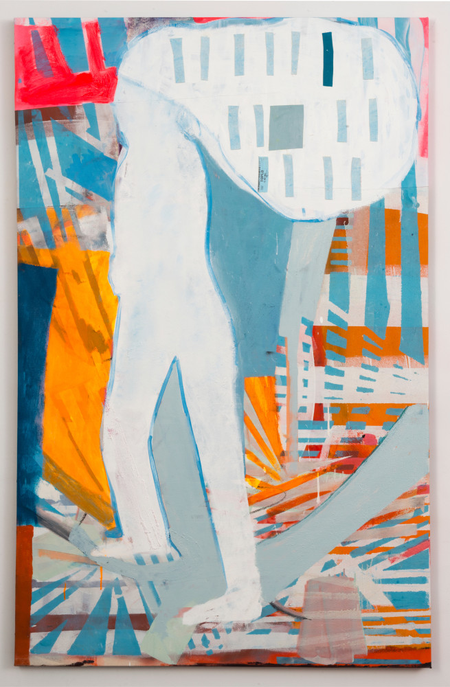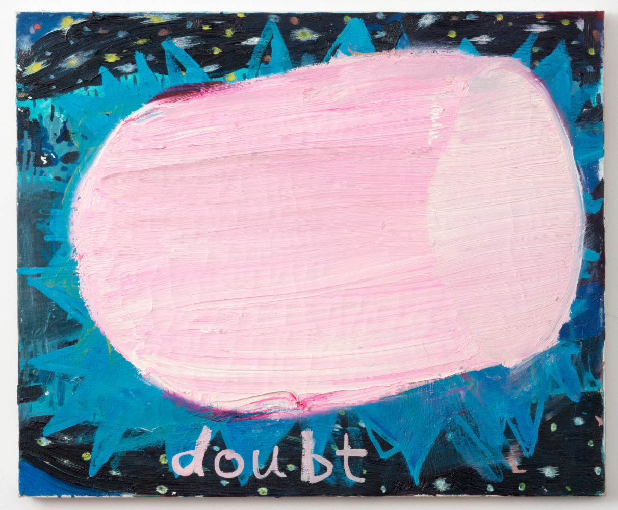 Johnson’s current solo exhibition at Freight+Volume, in keeping with his peripatetic process, is a multi-faceted display of all the artist’s dexterities in painting, sculpture and animation. His materials are as varied as the work itself – fiberglass, clay, oil, acrylic, fabric, bondo, enamel, digital media, etc. There are repeated motifs and gestures in the new paintings, which convey a sense of nervous energy and flux. They are heavily collaged, often even cut up, flipped over and then glued back together. There are also words and phrases rendered in bright colors: Triple Large Doubt and Little Doubt for example, and cut-out shapes which suggest letters, as in Arrangement for Henry. Other paintings incorporate collage in a kind of staccato, repetitive array, sometimes encased in thought bubbles, such as Walking and Thinking”.