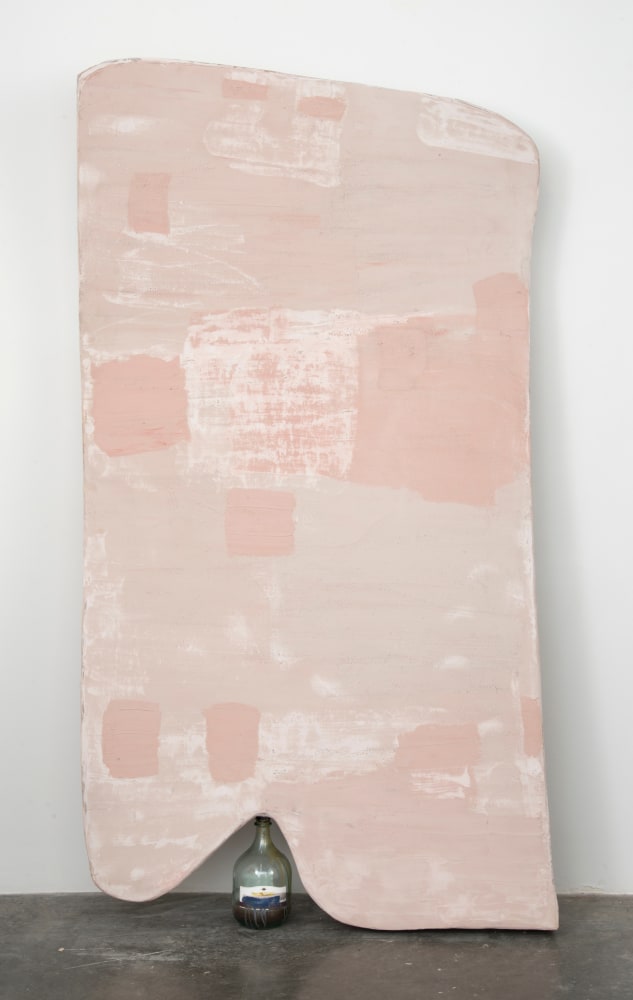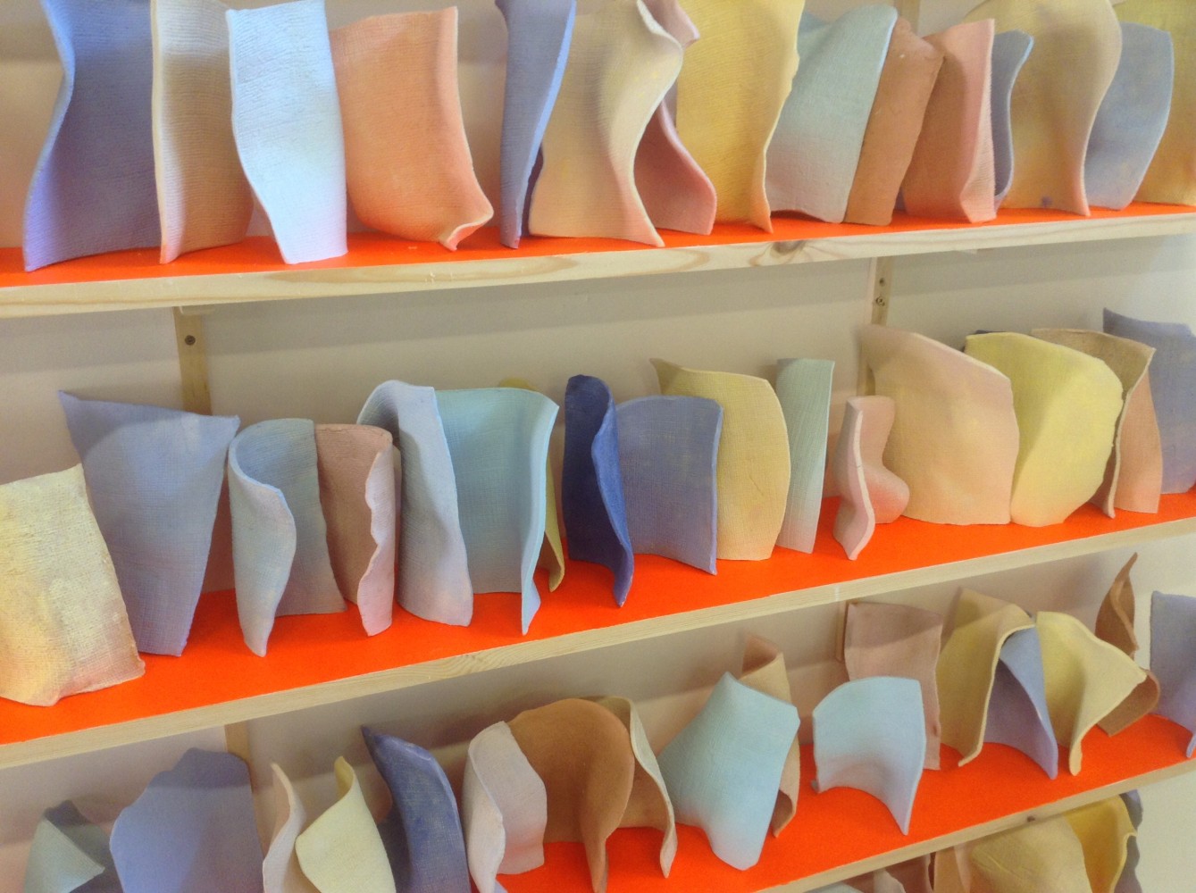 The sponge sculptures – both in oversize and life-size scale - are inspired partly by a intimate “kitchen table sculpture” made when leaning stiffened household sponges together. Johnson re-creates these sponge forms with twisted and contorted colorful ceramic slabs, which have been glazed, fired and placed on a series of gallery-length shelves, as well as an indoor/outdoor version of three giant sponges in six foot proportions (Der, Die, Das). The artist believes when seen together these sponges form a tender and humorous statement about human effort. Echoing this form in another room is an oversize mattress fashioned from resin, bondo and wood and balanced on a wine jug, undulating and bending with a playful reference to painting’s rectangular format, as well as an homage to Serra and Oldenburg.