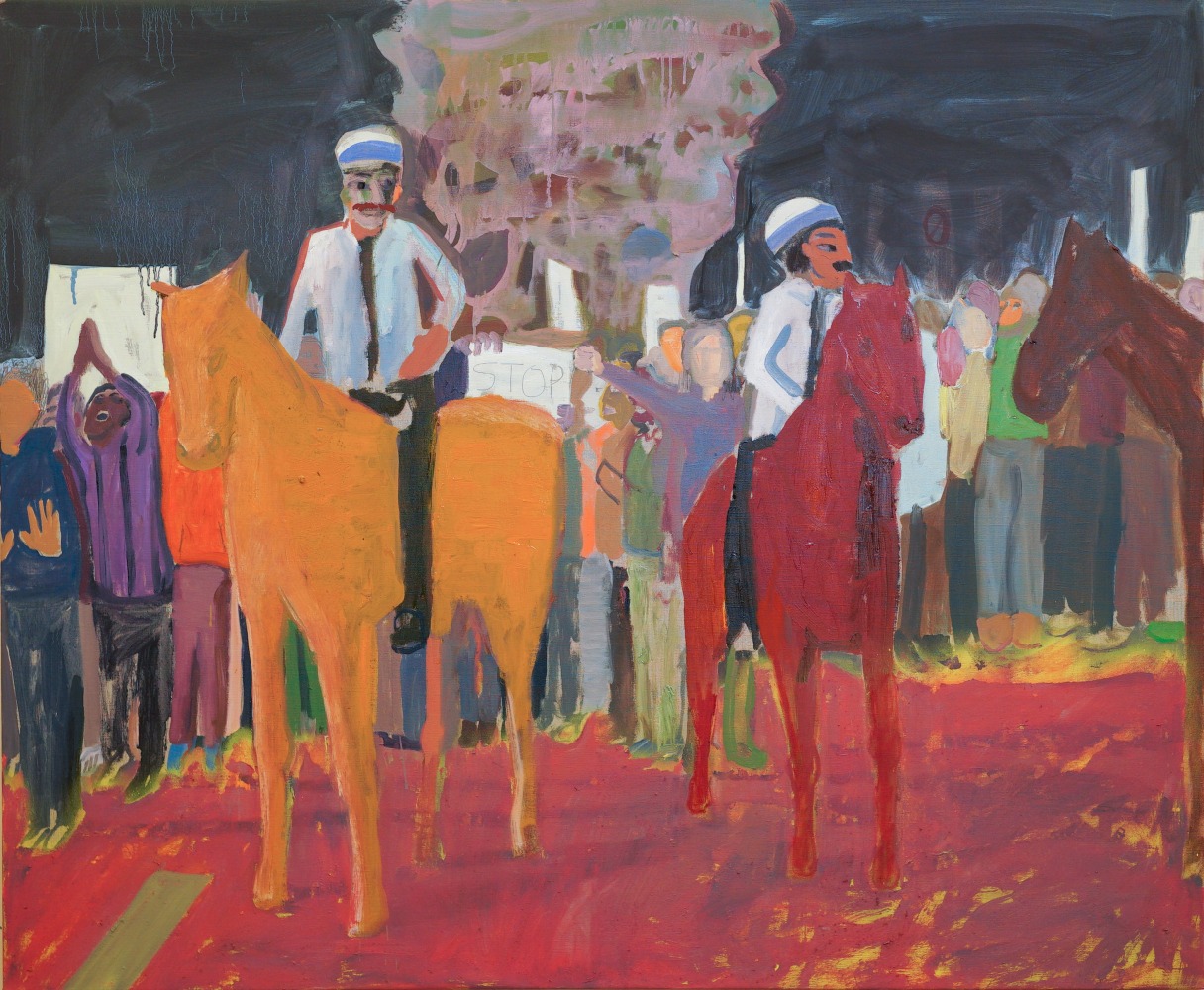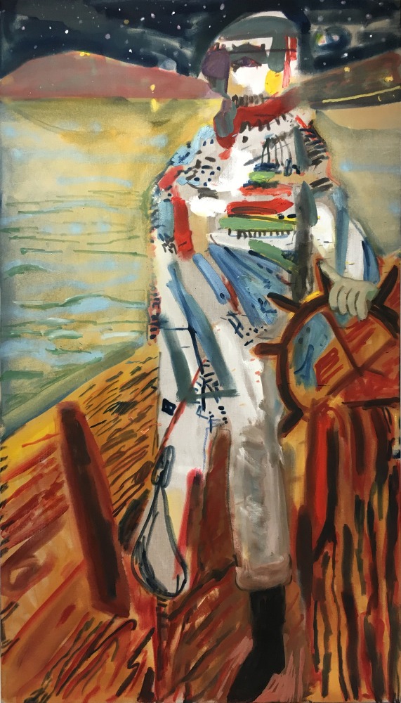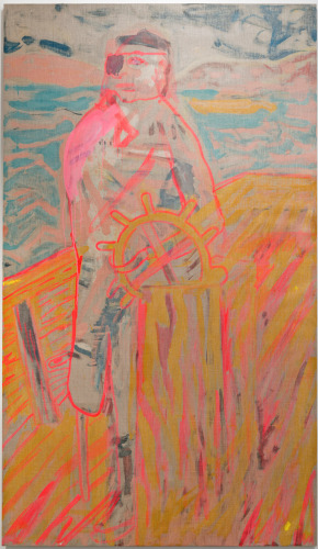 The title Cap’n Crunch comes from the breakfast cereal of the same name - a mass-marketed product that both literally and figuratively sugarcoats mythologies of America’s history. The Cap’n, dressed in an American Revolutionary-style naval uniform, serves as a symbol of American imperialism and the related cliches and mythologies, as well as a beacon of hope for the artist that we might learn to shed these beliefs. Pirate shows a romanticized buccaneer (Tampa), a little beaten up, but proudly steering his vessel from some heroic or violent encounter with another boat. He wears all the accoutrements of his trade, including a peg-leg and eyepatch; he is a tragic figure, reduced to signs of his identity by a painter with equal drive towards figuration and abstraction.