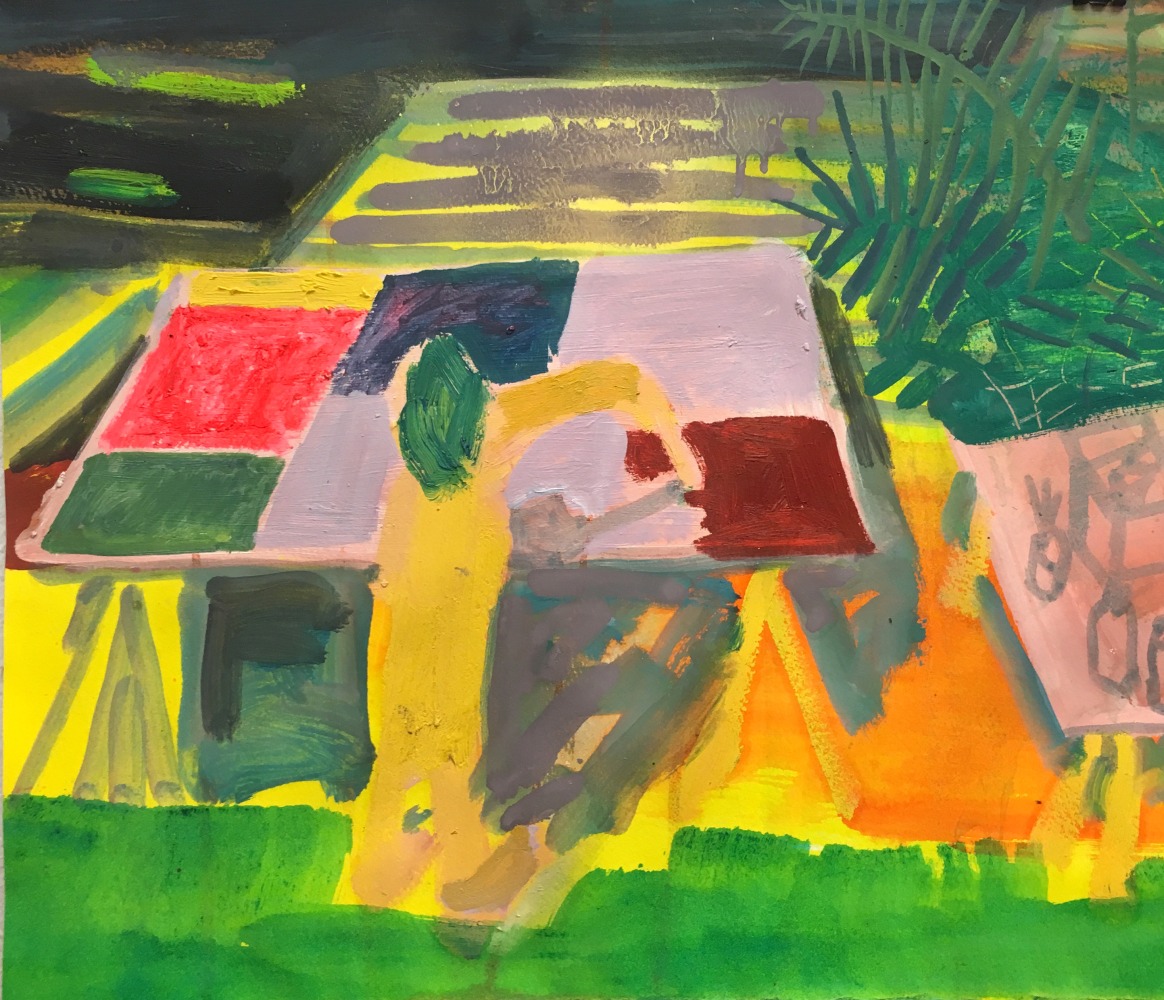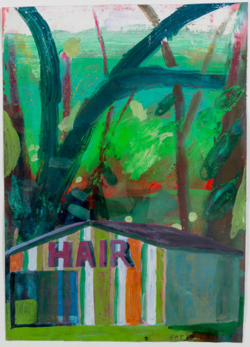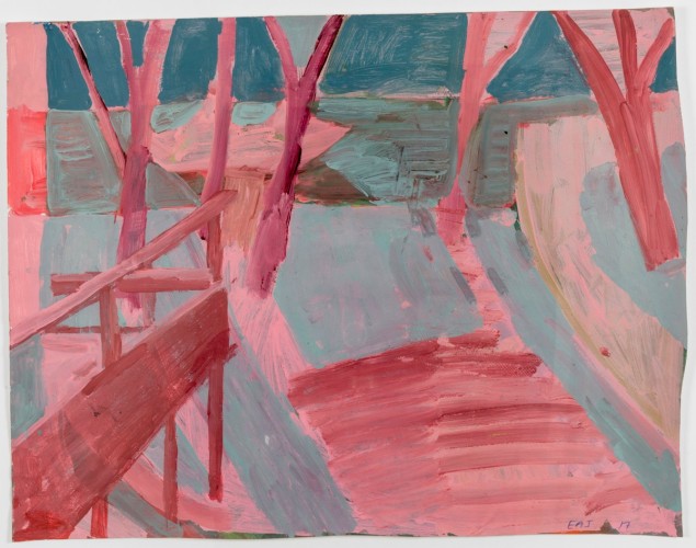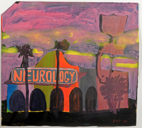 The artist also takes inspiration from tropical, worn-out and faded cities like Tampa, Florida, where he is currently based. Johnson depicts the Florida landscape in works such as Neurology, moved by the sun-bleached colors and vacant spaces, lush vegetation and old signs, no longer legible. A series of paintings on paper show objects under the canopy of the giant live oak trees and the simplified forms their curved branches make. These works are juxtapositions of scale as well as a vision of nature looming over the feeble endeavors of humans. In particular, Trees in My Backyard references the site of the only Civil War battle to take place in Tampa, a mere 200 meters from the artist's home, and the fact that the titular trees which populate Johnson’s daily life have borne witness to the tides of history.