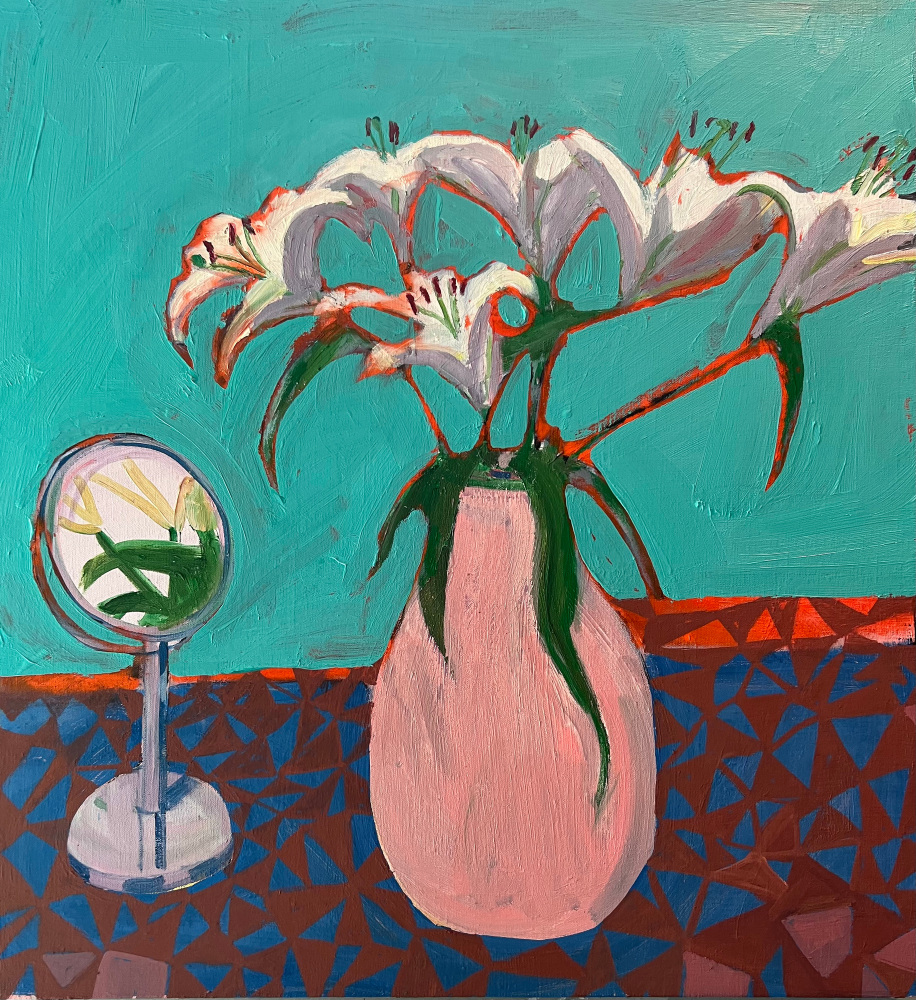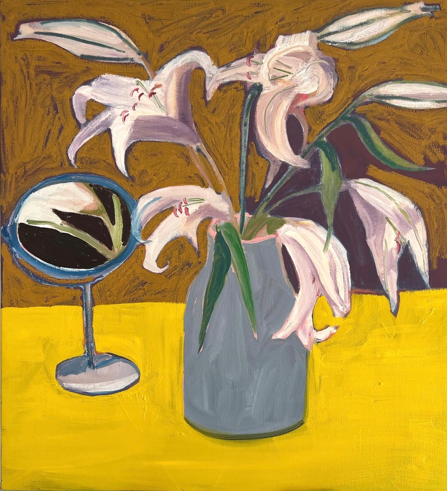 Additionally, Johnson will be showing a new series of still life paintings inspired by the lifecycle of lilies. Painted in exuberant colors, these paintings seem to become more alive as the flowers begin to droop. Johnson has often worked with the still life form and his painting practice seemingly builds from the foundation up, creating objects or persons on a sentient stage vis-à-vis an Infinity Room.