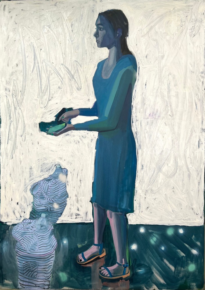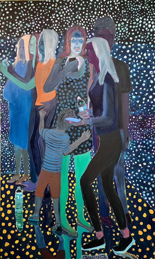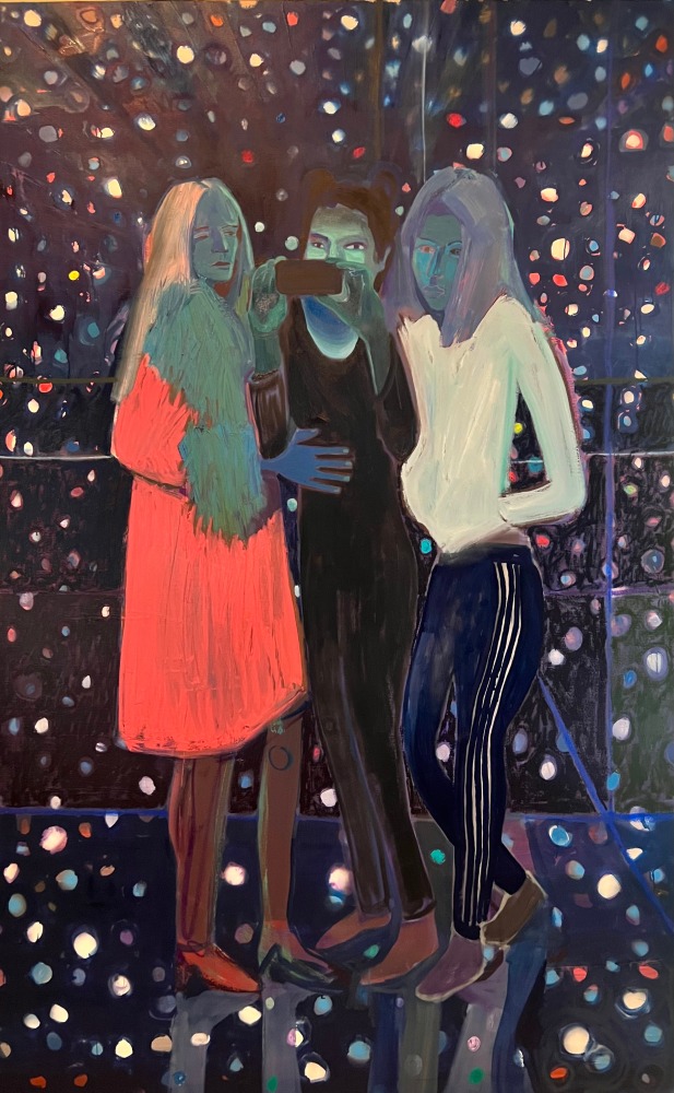 In All the History We Have Together, three women are posing for a selfie. While this action seems quotidian enough, one notes that the very flesh of the women has an ur-alien quality about it. The mottled spread of lights around them seems to underscore their absolute stillness as they pose for the picture. From the viewer's perspective, positioned in the same place as the mirror the women are looking into, one must ask the significance of observing a group of people observing themselves. The mannequin-like features of the women, whose faces only have as much detail as is necessary to give way to the illusion of a visage, feels perfectly at home in this painterly context.