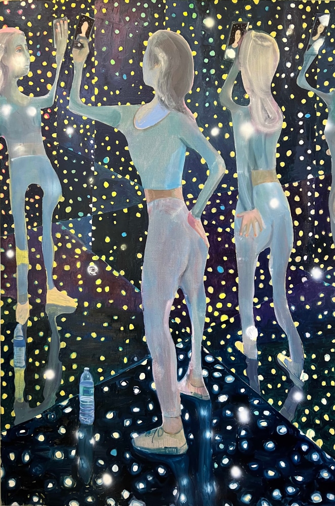 Referencing the concept of Yayoi Kusama’s Infinity Room, Ezra Johnson's recent body of work uses the idea of layering and reflection as an opportunity for a unique brand of playfulness. Each painting enacts a reflexive staging of staging, a game of mirrors which draws the viewer's gaze to the materiality of painting itself as a world-creating platform.