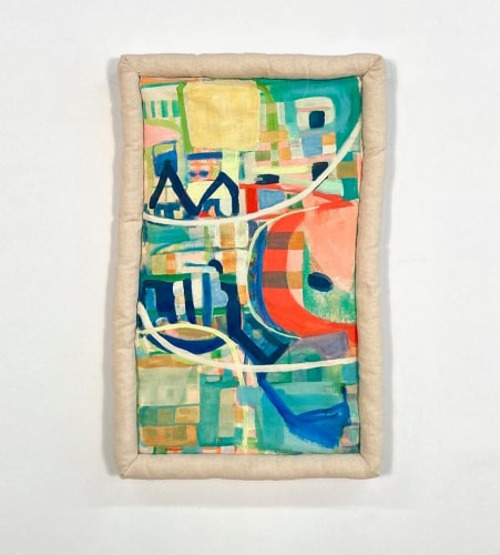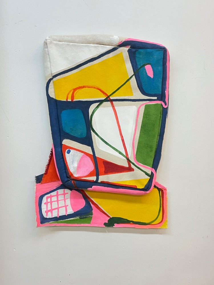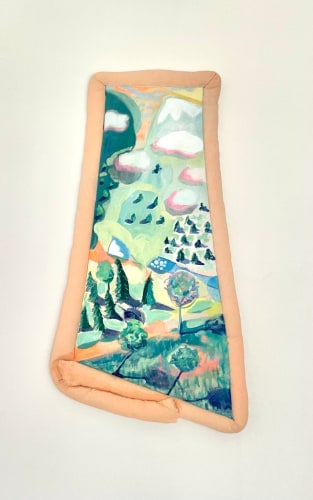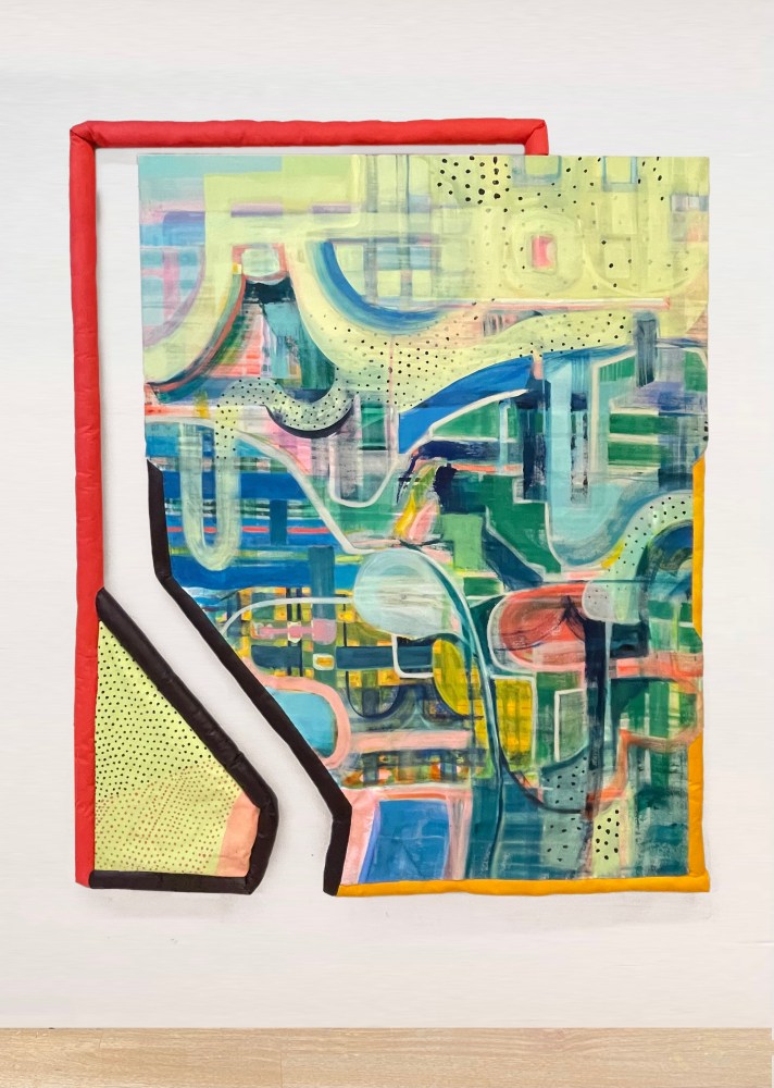 Jai Hart, for her part, warps the immediacy of her source images, making them more formalist and softly uncanny. In a work like “Isoline Mapping” (2024), the suggestion of a cityscape is apparent. But the weirdities that transmogrify the image, as though pixelating our perception of it, continues into the stuffed canvas tubing that contours the work. In “Isoline Mapping,” the tubing opens up the painting to incorporate the dimensions of the wall as backdrop. In another painting, Some Say "Stronger Wind = stronger tree, Stop blowing! give them a little hug! (2024) the tubing works to make the scene depicted more tactile, even intimate.
