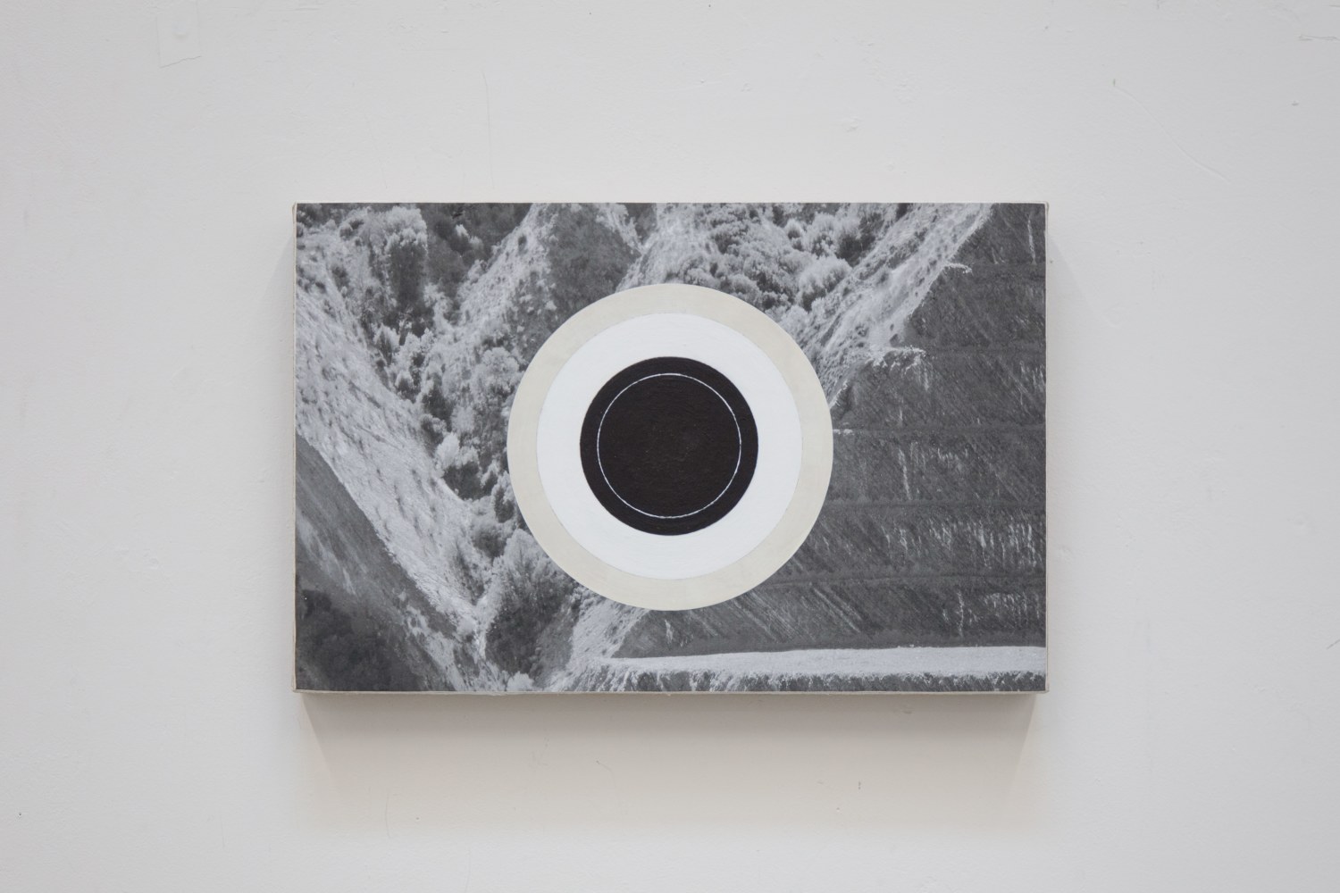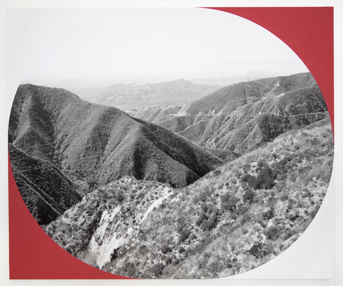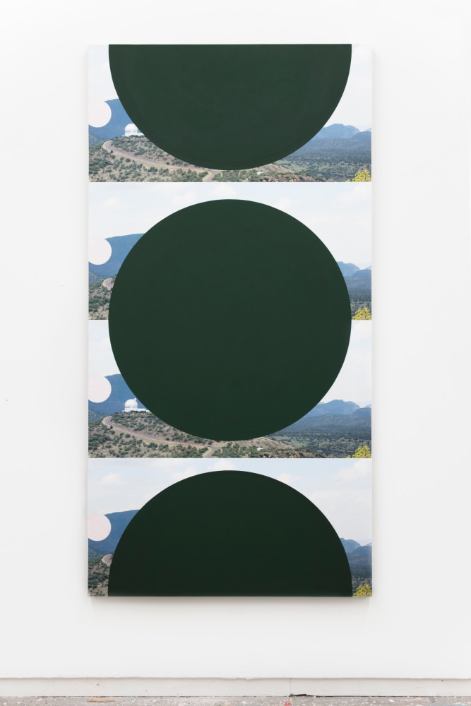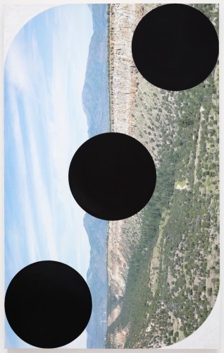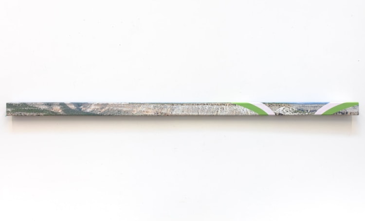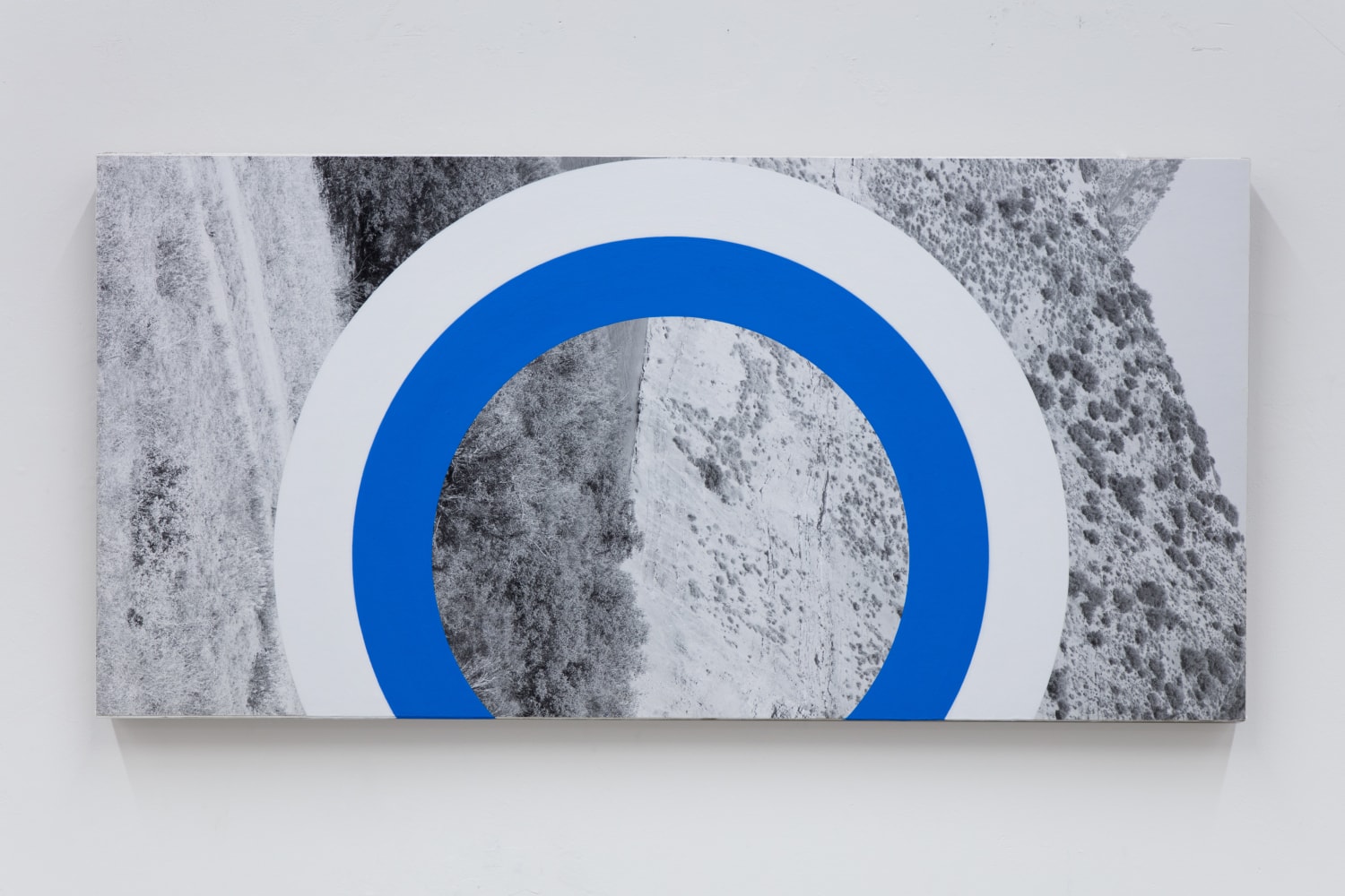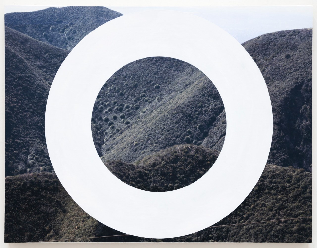 The works on display in West draw from a juxtaposition of abstract painting and landscape photography, a pairing that proves to be simultaneously idiosyncratic and highly intuitive. Bands, dots, and curved swathes of color punctuate scenic vistas, which are often dramatically cropped or manipulated. The enigmatic presence of the abstract forms pushes the viewer to ascertain some logic for their being; here, Hyde’s “symbolic and allegorical situation” is particularly rich, bridging the Western landscape and its attendant associations with those of abstract painting. While it is possible to appreciate his painterly interventions solely on the ocular level, the undercurrents of meaning and allusion in the works are what give them weight.