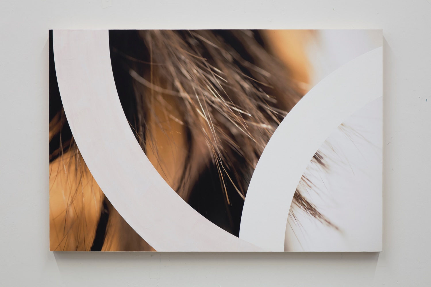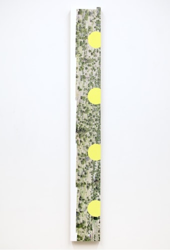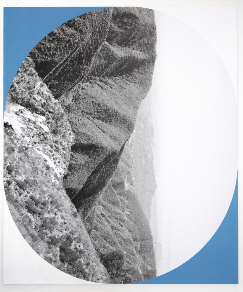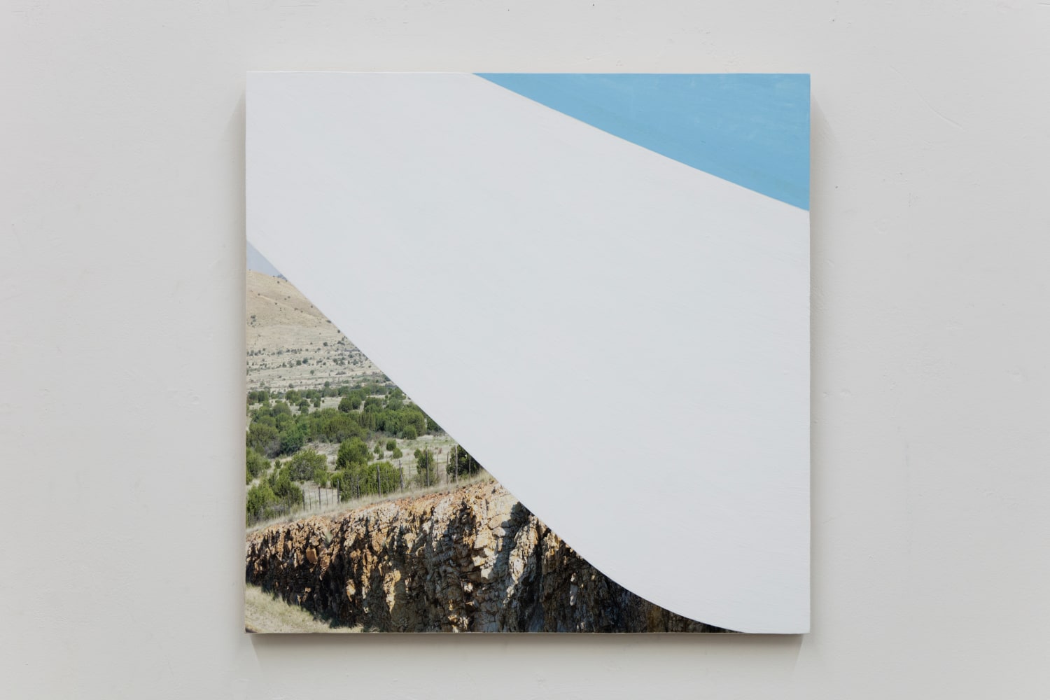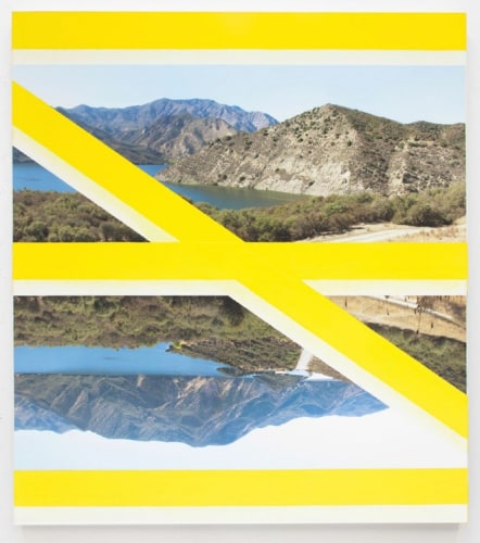 In Vale, a thick outline of a circle rendered in white paint hovers in front of an image of rolling hills, an imprint of a negative image that disrupts the lush environment. While the circle’s shape slightly echoes the curvature of the hills, its presence is clearly artificial, and works as a sort of challenge to the landscape. In Crossing (Yellow) the landscape is duplicated and mirrored horizontally, then overlaid with crisscrossing bands of yellow and white. Here, the painted passages have a more agreeable relationship with the ground image, recalling lines of sight, and possibly suggesting the path the viewer’s eye should follow. The works in West set up quandaries of perception and meaning, grounded in this dialogue of landscape photography and paint.