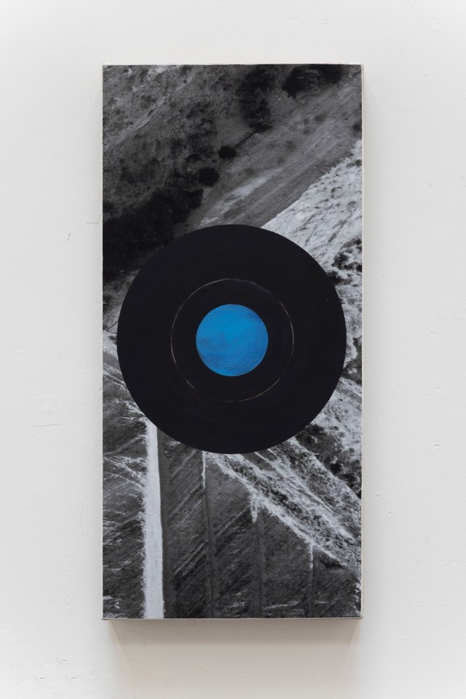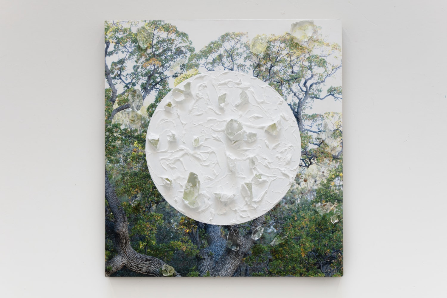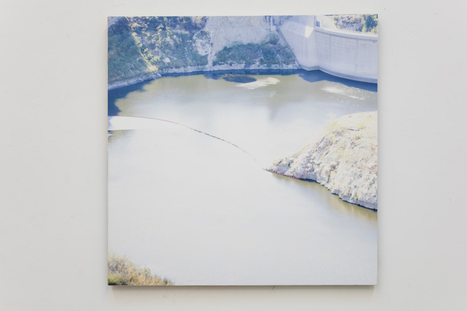 In Vale, a thick outline of a circle rendered in white paint hovers in front of an image of rolling hills, an imprint of a negative image that disrupts the lush environment. While the circle’s shape slightly echoes the curvature of the hills, its presence is clearly artificial, and works as a sort of challenge to the landscape. In Crossing (Yellow) the landscape is duplicated and mirrored horizontally, then overlaid with crisscrossing bands of yellow and white. Here, the painted passages have a more agreeable relationship with the ground image, recalling lines of sight, and possibly suggesting the path the viewer’s eye should follow. The works in West set up quandaries of perception and meaning, grounded in this dialogue of landscape photography and paint.