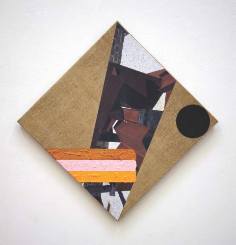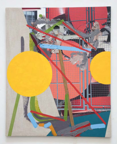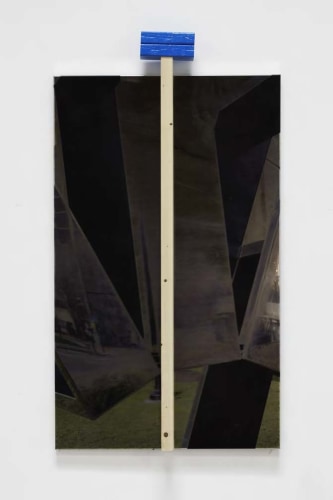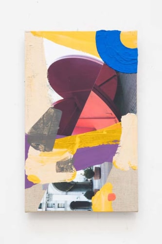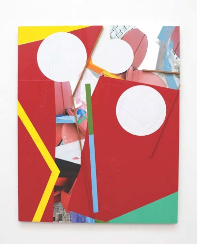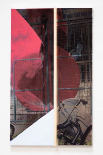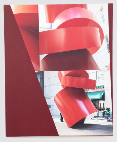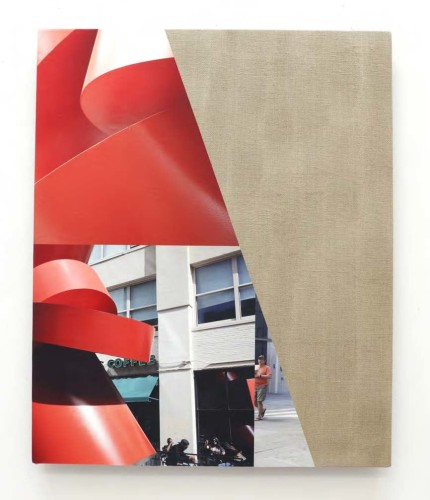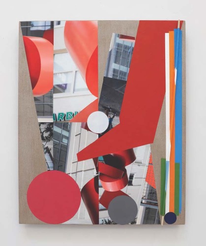 Hyde amplifies the locational contexts of the sculptures that appear throughout the show, with snatches of urban detritus and consumer society appearing throughout his cut-up, reformatted photographic grounds. In a series of three works, Public Sculpture with Coffee, Caffeinated (Sculpture), and Neighborhood (Sculpture), bits of Starbucks signage ricochet between planes of solid color and partial images of its namesake public sculpture, merging and conflating the quotidian function of the cafe in the urban environment with the rather esoteric character of public sculpture. Fragments of a bicycle, a ubiquitous symbol of urban life, weave throughout Bicycle and Sculpture and Public Sculpture with Bicycle; in other works, such as Scotch, the photographic print, linen ground, and passages of impasto paint manifest a self-contained expression of urban forms and materials, as if a rarefied, Platonic form of city life.