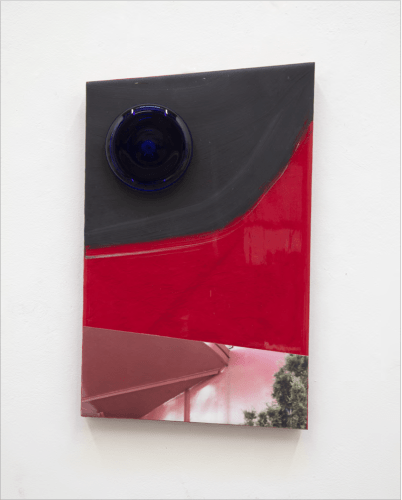 While these paintings are formalist in an almost gleeful manner Hyde also slips a sort of anthropomorphism to the work, evident in the aptly named Sculpture Tips its Cap and Onlooking (Sculpture), wherein in a blown-glass circle affixed to the photographic print takes on an eye-like appearance. The material constructions of Peak (Sculpture), and Stepping (Sculpture) are like physical allegories, mirroring the motion implied in their names; like two parallel narratives, the formal interplay of Hyde’s embellishments and the underlying photographic print are both dynamic and autonomous, converging in unexpected and viewer-dependant ways.