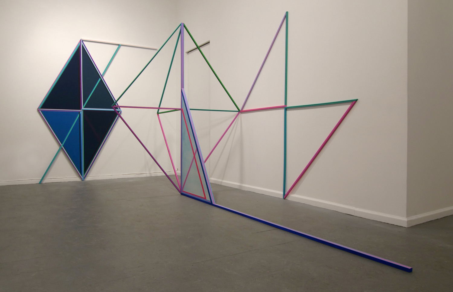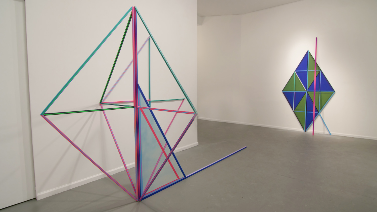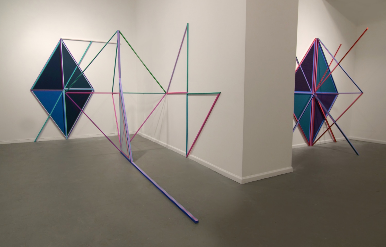 These installation artworks extend into physical space. The result is a series of compelling, unique objects arranged to create an immersive experience continually in flux. Visitors witness multiple exhibitions in one area as shapes shift and colors flicker, the effect dependent purely on viewpoint. Taking simple shapes and primary hues as a departure point, Johnson methodically builds these essential elements into a musical triumph: transforming a slow hum into an ecstatic crescendo.