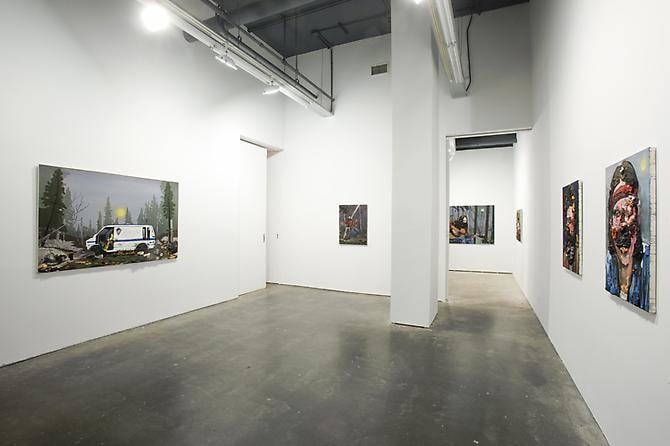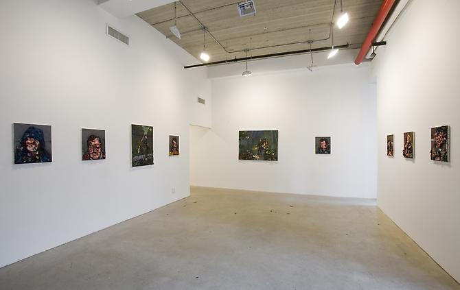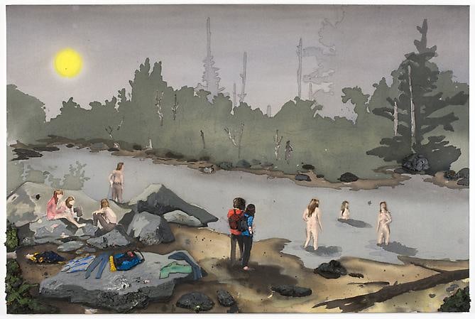 American suburban angst and melancholy, doled out in equal measure with foreboding themes of apocalypse, religious (oc)cult and extra-ordinary phenomena. He is a rare portraitist of life on the fringes of society: drifters, runaways, gypsies, ex-cons – icons of the dispossessed, deformed, lost, lonely and misunderstood. One of the signature pieces in the new series, “Down By The River”, depicts a dozen young men and women around the water’s edge, in various states of undress; clothing and backpacks are strewn on the rocks haphazardly. This beautifully painted, idyllic scene is a veritable latter-day Woodstock, a slacker’s “Dejeuner Sur L’herbe” - but again with something intangible, dispirited and mysterious mixed in.