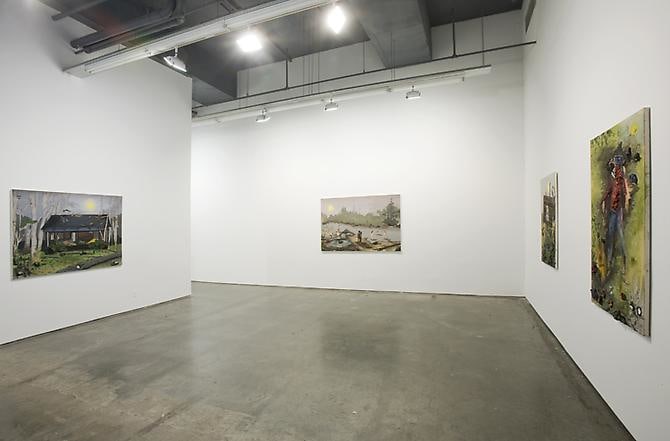Dorn uses whatever materials are at hand to convey these complex sentiments. Push pins, dried pigments, collaged magazine photos and studio detritus all gracefully weave their way into the canvases. The result is a rich medley of nostalgia and visceral sensation: they are at once delicate and heavy, open and contained, dark and light, introverted and exposed. His subjects – backpackers, hitchhikers, wayward couples, obscure musicians, burned out vans, shacks, skulls, mushrooms et al – leave an indelible impression on the viewer – as though seen previously only in dream. There is a spiritual and physical authenticity - and a stark beauty - to these paintings, which distinguishes Dorn from his peers. At the end of the day, what “Remains” are his own, very personal, truths.