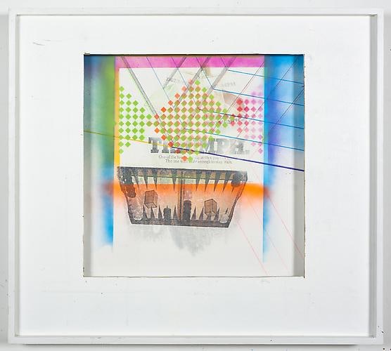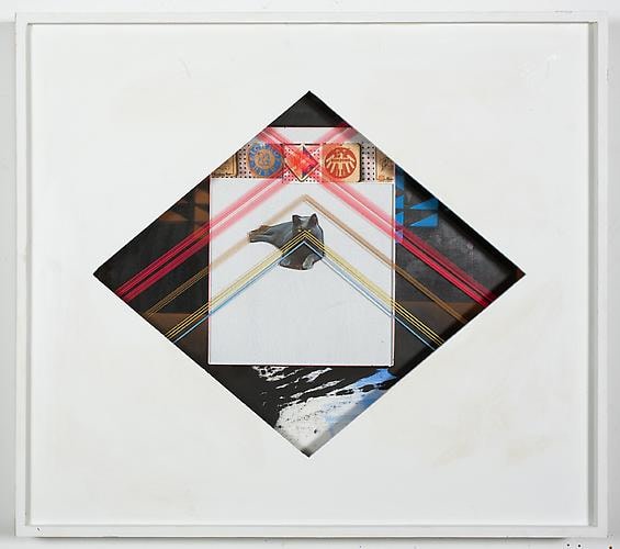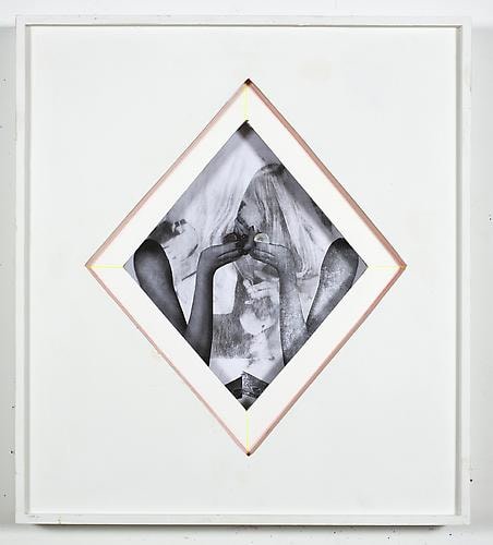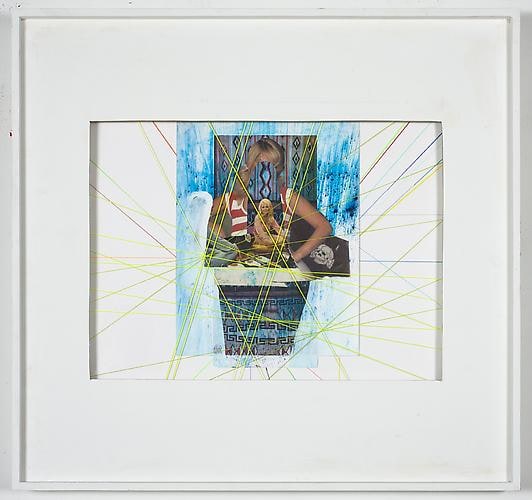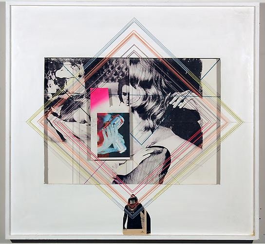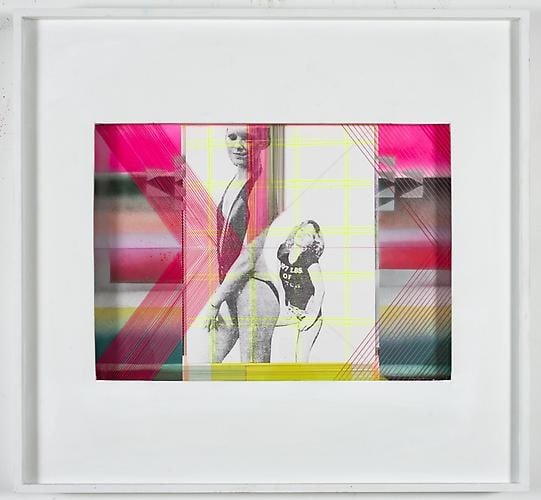 Beyond the Rocks, as the show title, is a double- or perhaps triple-entendre. Referencing the 1922 silent film directed by Sam Wood, starring Rudolph Valentino and Gloria Swanson (considered a "lost film" for most of the twentieth century until it was discovered in 2003 by an eccentric Dutch collector), the title also suggests going beyond the "rocks" (hard times, booze), as well as literally a journey through a rocky northern landscape. Certainly, many of these works were made at Schiele's studio upstate, where she sequestered herself for months before the show, steeped in nature. Organic energy and sensation bristle within Schiele's work. Her raw dissection of 60's and 70's pop consumerism and kitsch culture from that era are evident in her tongue-in-cheek juxtapositions. Couples with picture-perfect hair are depicted locked in carnal embrace beside a Brylcreem ad or tropical travel brochure, and against silkscreened slogans like "FAT GIRLS' DIET" or "NEED MONEY." There are some interiors, small moments, video games, TV excerpts, details such as beer bottles, beach blankets, board games, scenes from movies, and other assorted media references. Schiele writes,