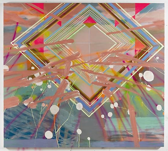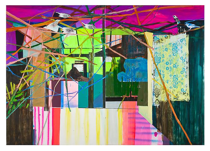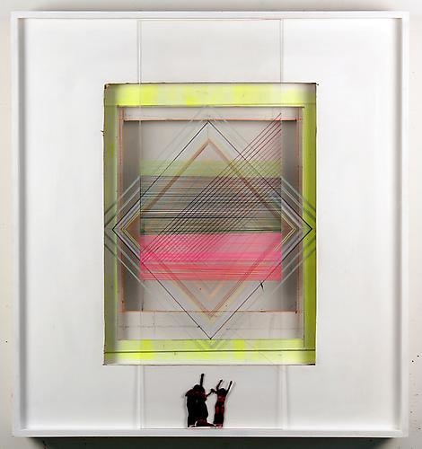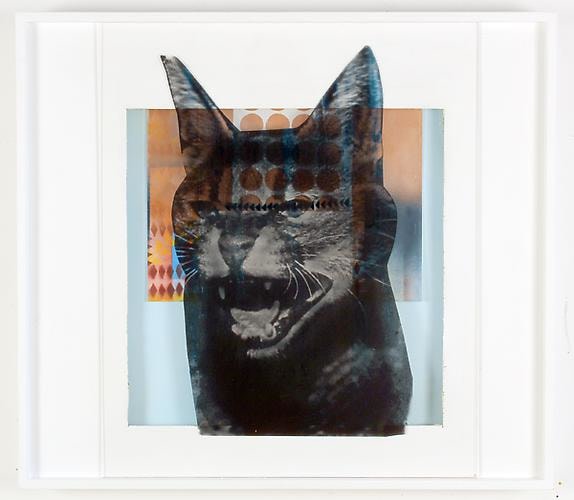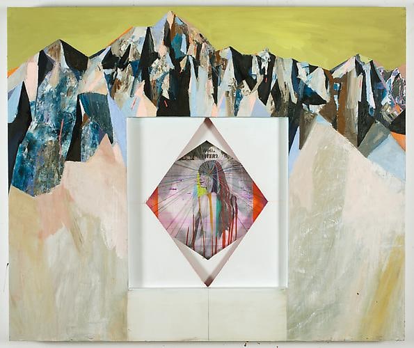 This spirit of crossover and counterculture movement (albeit not the chemically-induced kind), is highly apparent in the work and passion of Kristen Schiele. Dividing her time between New York and Berlin, Schiele is a wonderfully agile and gifted collage artist and "sculptural painter" who weaves poetic tableaus from the fabric of pulp and rave culture. Indeed, Through a glass darkly is how she views nostalgia, mass-media culture, and the collective past; in her shadow boxes she frequently employs a layer of clear or colored Plexiglas in front of collaged and painted material to emphasize this effect. Some constructions are cut and assembled with holes and angles, serving as theatrical pop-up boxes, maquettes of a larger stage replete with human and animal marionette imagery. Other works are straight canvases, epic and magisterial in their beauty. The total effect is a medley of gorgeous opposites: punk and elegant, refined and dorky, brutal and playful, neon and subtle, classical and burlesque, high and low culture, old-world and new. Schiele welcomes and seduces the viewer to join her on this magical, mind-expanding journey.