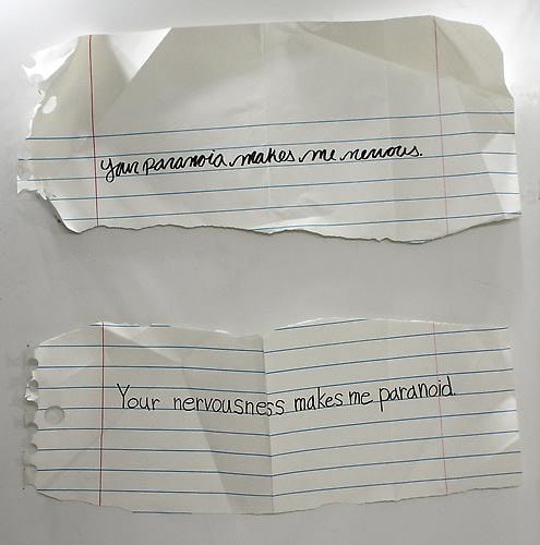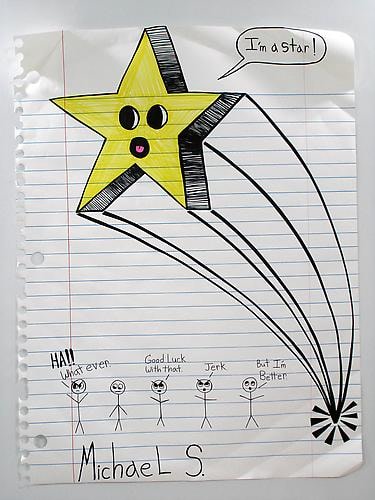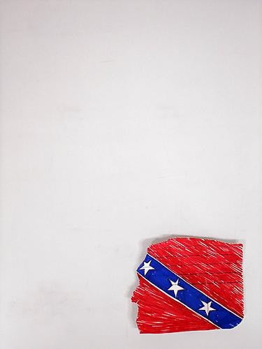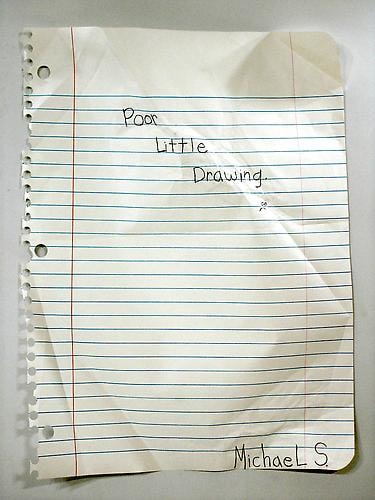I first encountered Scoggins’ art at Art Basel Miami in 2002. At that point, fresh from a SCAD MFA and living in Georgia, he was creating faux chalkboards - raw, trompe l’oeil affairs with half-erased messages and kernels of wisdom from the classroom. Shortly after, Michael arrived at his present mode – 70x50 inch oversize notebook paper, hand-cut, crumpled and torn with trademark blue lines, spiral holes and rounded edges. Throughout many genres he has maintained this look – his All American Families, his Superhero Comics, his Presidents series, his journal-entry confessionals. Employing an admixture of graphite, prismacolor, and assorted media, Scoggins manages to say quite a bit with very little – and always with insight, irony and timeliness.