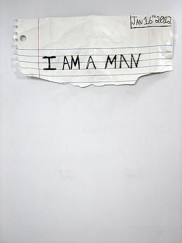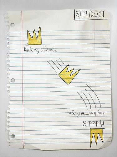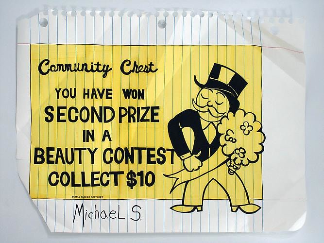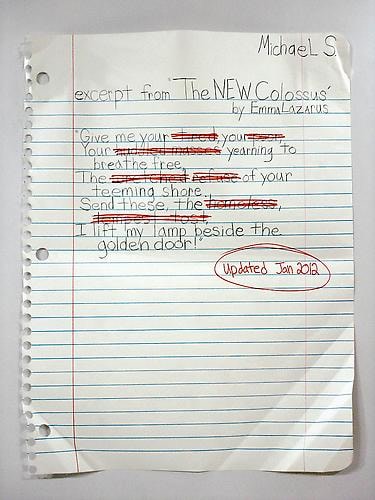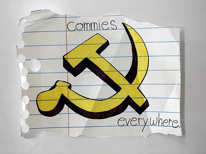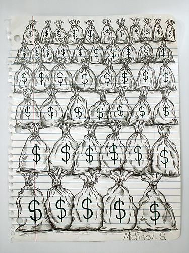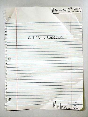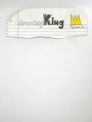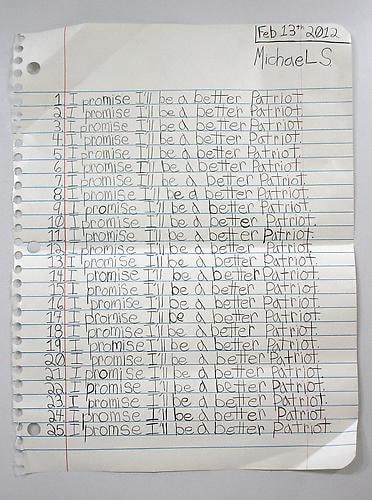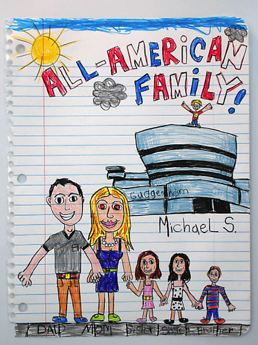 His newest exhibition, Us Against Them (Scoggins’ first solo in NYC in five years) dives in and tackles current global issues of unrest and inequality, corporate greed and bailout, peacekeepers vs war crime perpetrators, giant banks vs the little guy. His ingenuous, pre-teen alter ego “Michael S.” again slews the Goliaths like a David with his mighty (albeit mistake-ridden) cursive and magic-markers. The lessons learned in grade school are nowhere more relevant than now: share the sandbox, play nice with others, be a real Patriot, whatever goes around comes around, etc. In works such as Art is A Weapon, Poor Little Drawing, and All American Family XVI (in front of the Guggenheim), Scoggins deftly skewers art world posturing and hype; in others, like The King is Dead (Long Live the King), and I Promise I’ll Be A Better Patriot, he calls into question our civil liberties and the abuse of same by the government administrations.