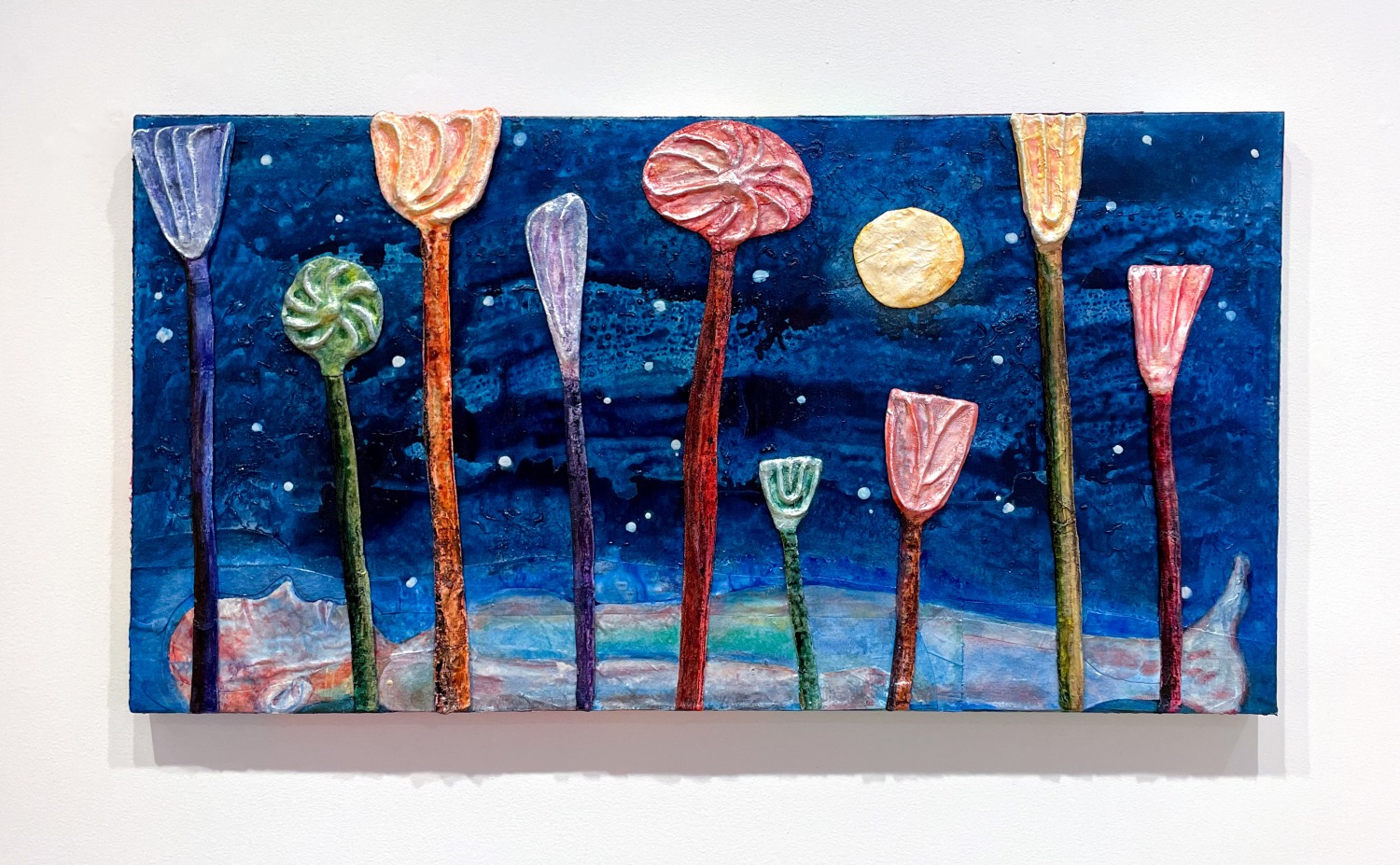 Another work, Silver Cloud, leans less on pattern or collage, and more on the intimation of symbolism. One thinks of the distinction between logos and logo: of what it means to represent something directly and what it means to stand in for something absent. The literal features of the work give way to hidden depths and recesses rendered all the more uncanny for the minimalist means by which they become accessible. The rounded silver oval, expanding across the work, carries within itself the potential for the visible canvas to contain something unseen, not unlike a lunar eclipse.