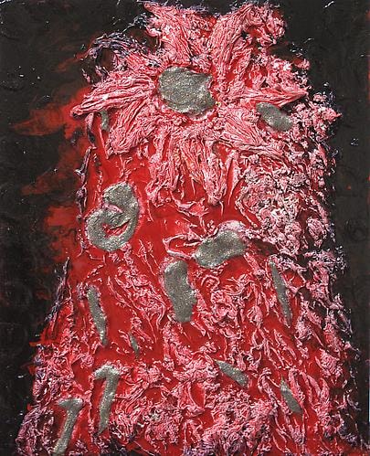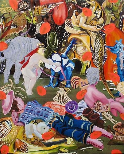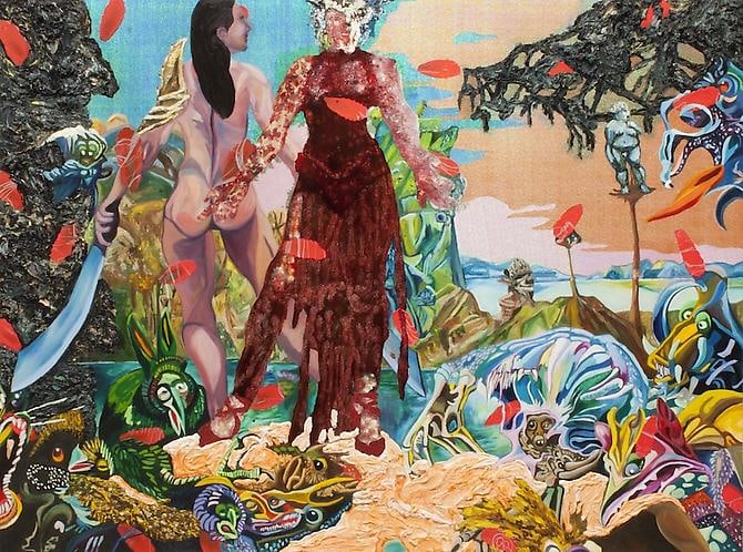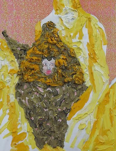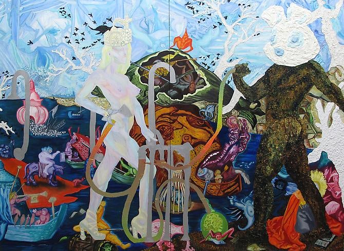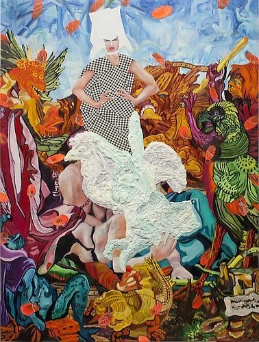 Min Hyung brings a rich fantasy life to her expressive painterly narrative. In her newest series, focusing on heroic and mythological women, her personal history is intertwined with legend to form a compressed, colorful backdrop, against which her protagonists interact. Her thick impasto and tapestry-like collage are rife with idiosyncratic symbol and affect, leading the viewer in and out of a dream-like environment, which combines varied elements of her mixed cultural past. She writes: “In Alexander McQueen’s exhibition “Savage Beauty” at the Metropolitan, McQueen said,‘I want to empower women; I want people to be afraid of the women I dress.’ I often use his dresses for my female hero because his ideal woman overlaps the idea of my female hero.” As part of her narrative series “The Fifth World”, Hyung references old masters, science, history, culture, fashion, performance, comics, and surrealistic historical paintings such as Delacroix’s “Liberty Leading the People”, Bosch’s “The Temptation of St. Anthony”, and work by Mathias Grunewald and Max Ernst. Hyung’s painting “Madonna” derives from both the bible and the pop singer, as does her “Birth of Venus”, loosely based on Botticelli’s masterpiece. “My female hero is strong, confident, and yet retains her femininity; she comes from a place of power. She is a warrior and a nurturer…stylish, powerful, sensual, edgy, aggressive, positive, progressive, mighty, competitive, and majestic. She is never weak. She is dominant, yet she is generous.” Hyung’s own journey as an artist has been a long migration. She graduated with a BA in poetry/Korean Literature from Seoul Korea, and received her BFA from the Ontario U. of Art and Design. She has had solo exhibitions in Toronto, Calgary, and Chicago, and received several awards including a scholarship from The Art Dealers Association of Canada. Her work can be found in the Femme Art Collection in Toronto, Colart Collection in Montreal, and Howard Tullman Art Collection in Chicago. She currently lives and works in Toronto.