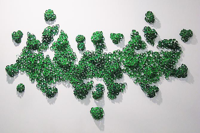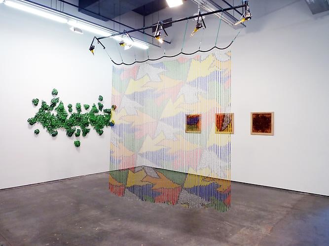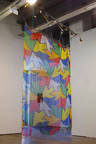 Meridith Pingree’s kinetic sculptures literally move through space – and address issues of transience and impermeability in elegant, airy forms. The artist physically tracks human behavior and traffic patterns utilizing quasi-scientific, homespun, reactive sculptures. Sensors pick up on people's energy and movement throughout the gallery; her work exists as amplifications of this subtle energy, creating unconventional, complex portraits of people and spaces. Sourcing dreams, magic, plant life, robotics, geometry, and textile design, she amalgamates these into lifelike creatures. The Magic Curtain hanging central in the front gallery feeds off ambient energy. It mutates its shape, bending and curving in slow jarring movements using motion sensors coupled with small motors. Something like an ice crystal or virus, Pingree's works move and grow, falling into complex patterns, questioning meanings of space and time, and what it is when we consider something to be alive. Pingree is a New York-based artist, a graduate of Skowhegan and holds an MFA from RISD. She has shown widely, and is included in the upcoming survey of kinetic art at Brown University opening this fall.