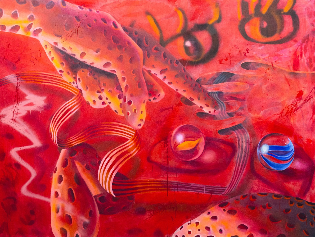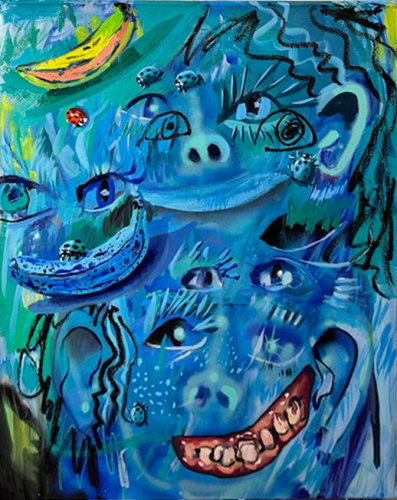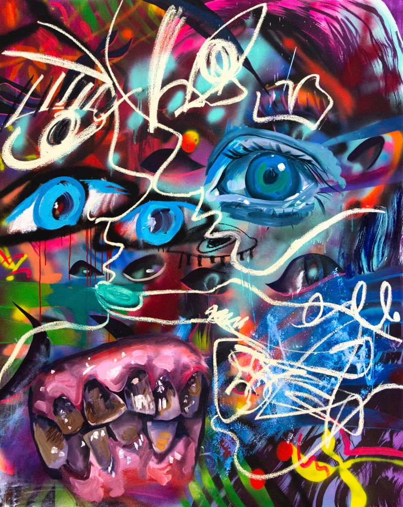 It’s Westbrook’s deception of mouths which most aligns with the porousness cutting into her work. Decidedly, spray-paint was designed to recreate this one human feature. Lips are not so much for tasting as for gently outlining hidden depths almost none of us get to see. The real innards of the mouth, as suggested by one painting, is a beachy landscape viewed at twilight. In other words, the true inner nature of what we speak and express will always elude us, and is anybody’s guess.