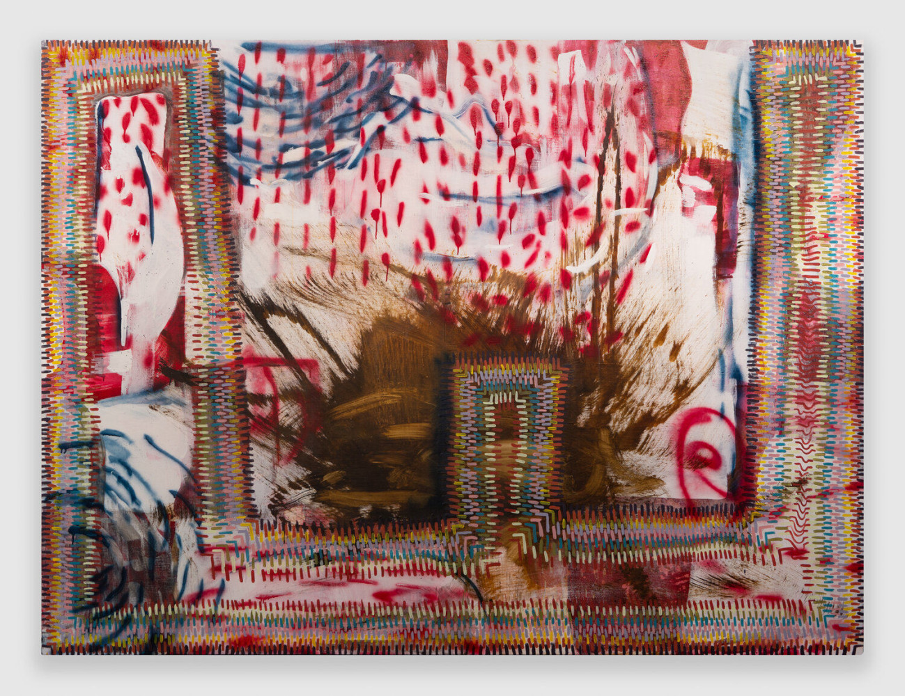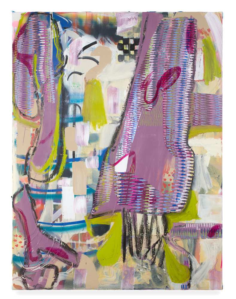 The textile-like appearance of these meticulously painted stitch patterns transforms the visual identity of the work, disrupting the linear reading of them as representational objects and instead projecting a sense of an organic, unified whole. In Bookends, a viscous stream of paint appears to ooze from the stitch-motif background, its liquid form and marbled hues imparting a mysterious dimensionality that adds further intrigue to the already psychologically primed composition.